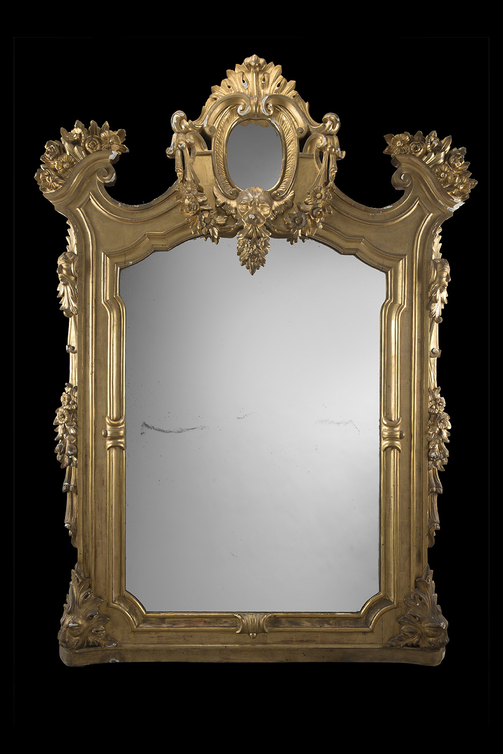 Caminiera in legno intagliato e dorato con cimasa a specchio scolpita a mazzi fioriti e testa leonina che sorregge un festone. Montanti decorati a volti fantastici e mazzi fioriti. Secolo XIX (cm 200x125) (difetti)