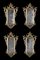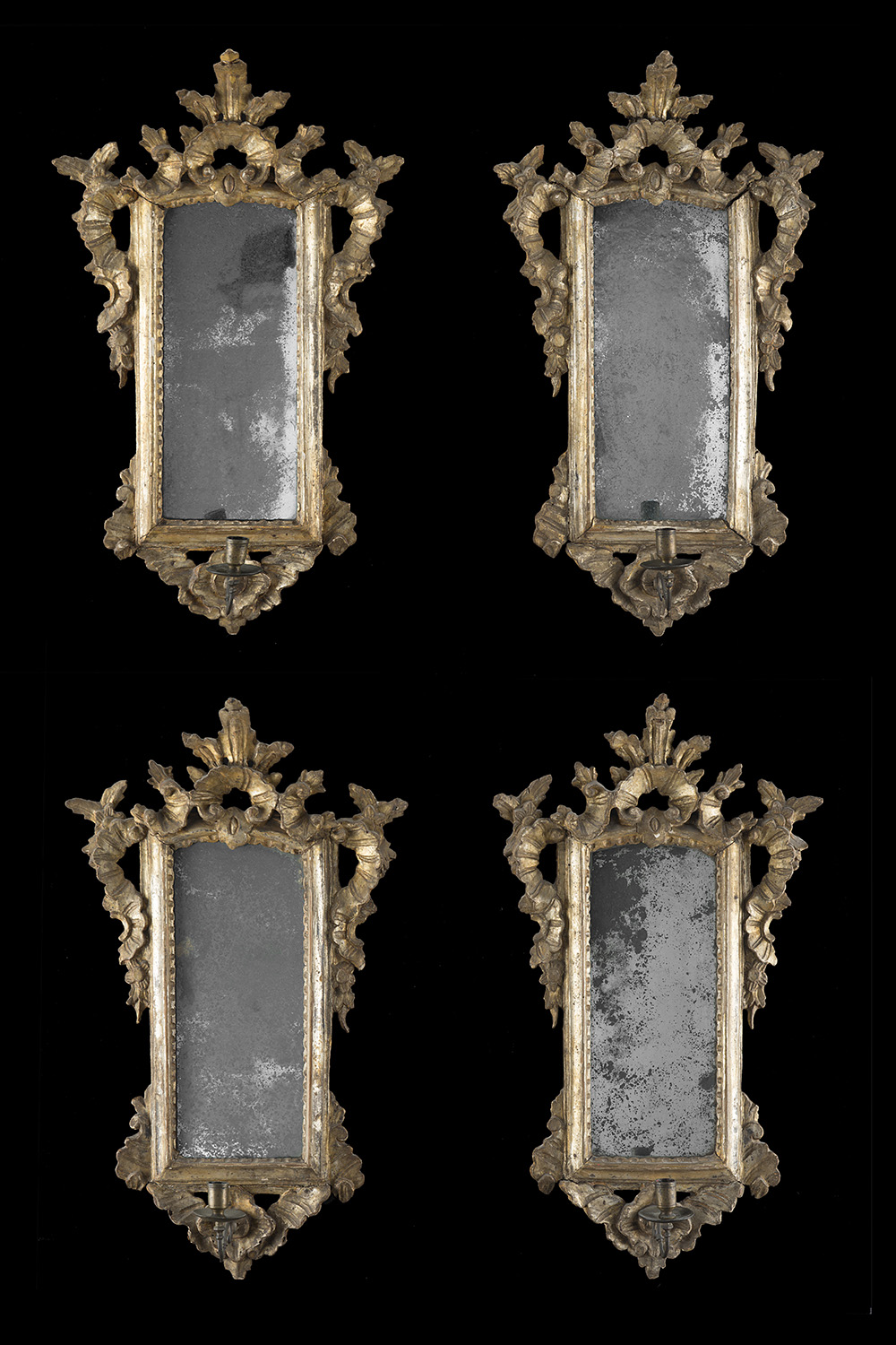 Gruppo di quattro specchiere in legno intagliato, dorato e argentato, pendenti di fiori e volute traforate. Appliques in ferro battuto. Secolo XVIII (h. cm 63) (difetti)
