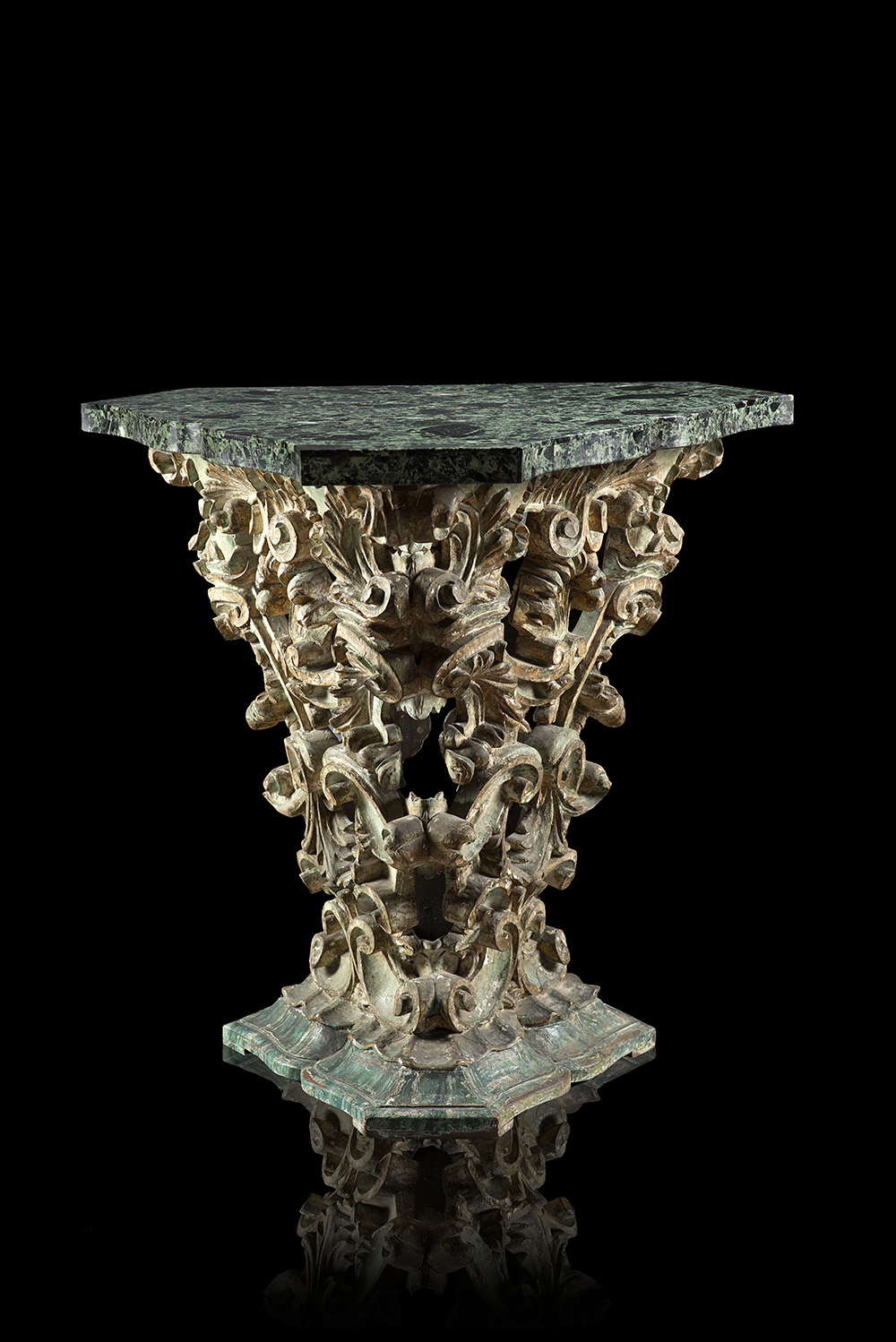 Tavolino di forma sagomata con base in legno scolpito e laccato a fondo verde con tracce di doratura a volute e valve di conchiglia. Piano lastronato in marmo (cm 90x84x80) (difetti)