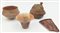 TRE VASI E UN FRAMMENTO DATAZIONE V-IV MILLENNIO A.C. E III SEC. D. C. Coppetta troncoconica, decorata a motivi geometrici e frammento di orlo dipinto con teoria di hibex in corsa a sinistra alternati a cervidi con corna ramificate, cultura Rey, Tepe Sialk; olletta cultura Hamangia, Romania, decorata sulla risega con gruppi di incisioni verticali; contenitore con coperchio decorato con maschere umane in rilievo cultura Kushan, India, (4). Alt. da cm 11 a cm 6,8 Cfr.: G. Ligabue e G. Rossi Osmida, Animali e mito nel Vicino Oriente Antico, Padova 2008, p. 170, fig. 2