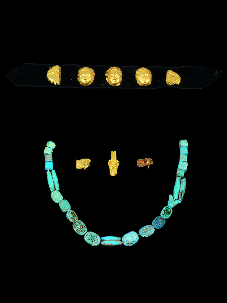 COLLANA, ELEMENTI IN ORO E ARMILLA DATAZIONE: Medio e Nuovo regno, VII-VI sec. a. C. MATERIA E TECNICA: faience egiziana, lamina d’oro sbalzata Collana in faience azzurra formata da nove scarabei con parte inferiore incisa con geroglifici e tredici vaghi di forme diverse; due occhi udjat ed una trachea sema in lamina d’oro; cinque elementi in lamina d’oro pertinenti alla decorazione di un abito o di un’armilla, due modellati a elementi vegetali e tre a volti umani stilizzati (9) PRODUZIONE: cultura egiziana e cultura frigia STATO DI CONSERVAZIONE: integri DIMENSIONI: lungh. cm 3 e cm 2 PROVENIENZA: Casa d’Aste Pandolfini, Firenze Il lotto, in base alla legge italiana, non è esportabile / This lot, according to Italian law, can not be exported