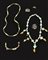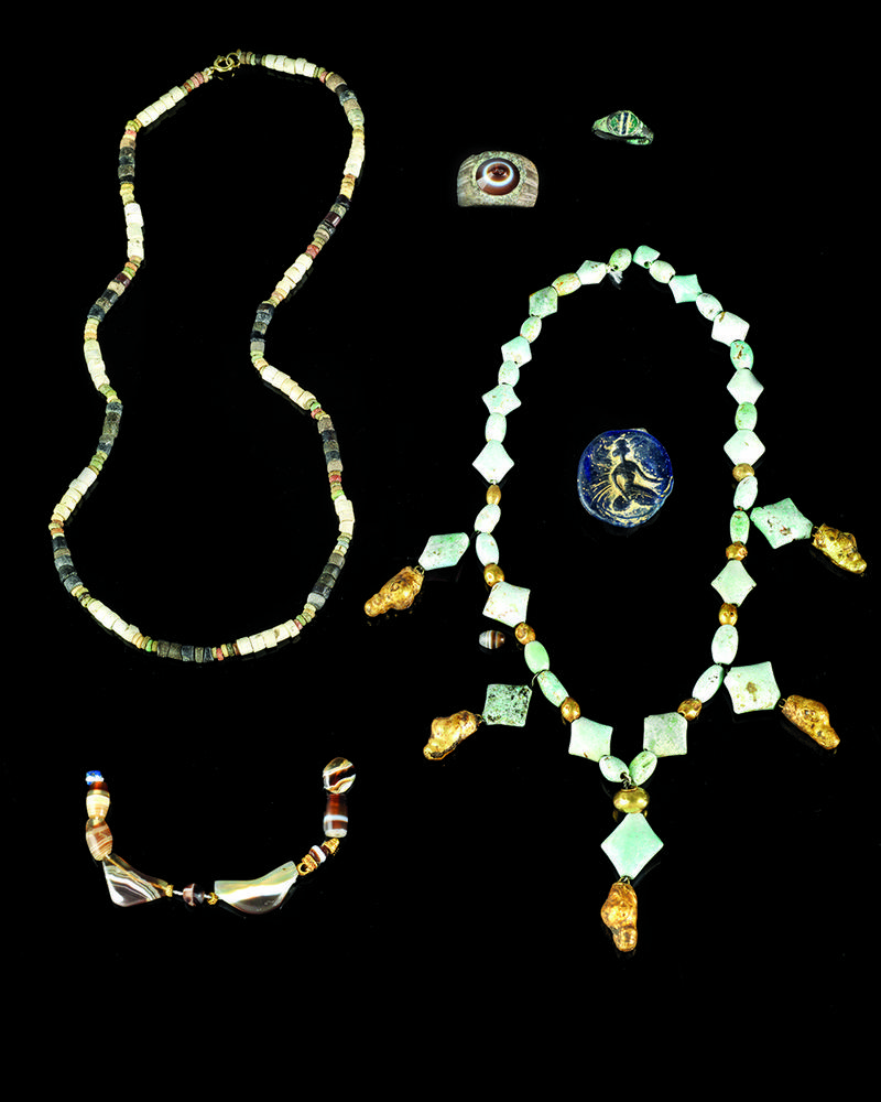 LOTTO DI GIOIELLI DATAZIONE: I-III sec. d.C. MATERIA E TECNICA: argento, bronzo e oro laminati e cesellati, faience azzurra, agata incisa e paste vitree Anello in argento con tre nervature in rilievo e castone piramidale in agata con inciso un piccolo delfino; anello in bronzo con castone ovale in pasta vitrea incisa verde, blu e bianca che imita un’agata-calcedonio; collana costituita da piccoli vaghi circolari in paste vitree colorate completa di fermatura moderna in oro; collana in faience azzurra con vaghi romboidali e pendenti a testa di cigno in oro, parte di collana in agata striata e oro, applique in vetro blu con figura femminile (6) PRODUZIONE: cultura greco-romana del Libano STATO DI CONSERVAZIONE: integri PROVENIENZA: Yousef Molayem, Roma CFR.: L. Ruseva Slokoska, Roman Jewellery, Londra 1991, p. 178, n. 215; pp. 190-193, nn. 243, 251