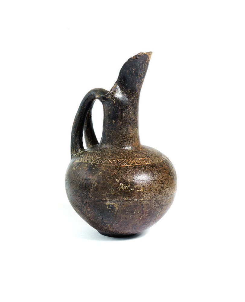GRANDE OINOCHOE VILLANOVIANA DATAZIONE: fine VIII sec. a. C. MATERIA E TECNICA: impasto depurato bruno lucidato a stecca, ingubbiatura rossiccia, decorazione ad impressione e incisione, modellata a mano e a tornio lento Grande oinochoe a bocca trilobata, con bocca quasi verticale, pronunciata da due apicature, alto collo cilindrico distinto dal corpo globulare schiacciato, fondo piatto, ansa a doppio bastoncello impostata dall’orlo alla spalla, decorata ad incisione sulla spalla con due fasce una con trattini obliqui e quella sottostante con motivo a reticolo PRODUZIONE: ceramica etrusca centro-meridionale STATO DI CONSERVAZIONE: ricomposta da frammenti DIMENSIONI: alt. cm. 26,5 Il lotto, in base alla legge italiana, non è esportabile / This lot, according to Italian law, can not be exported