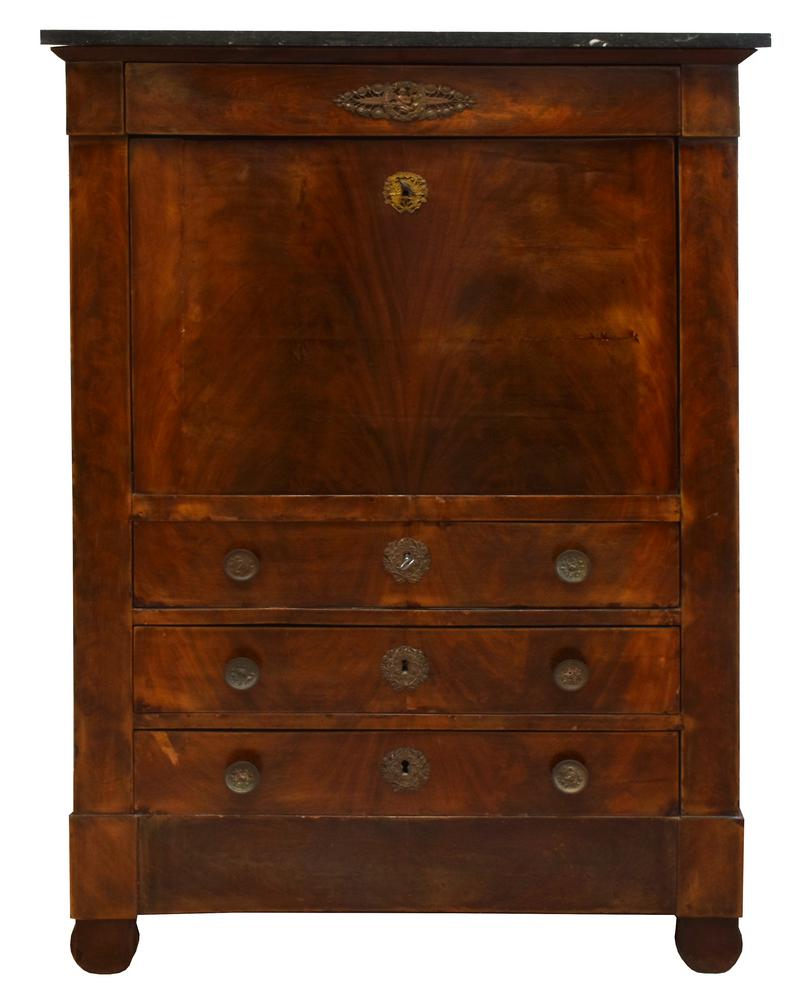 SECRETAIRE lastronato in piuma di mogano Francia, prima metà XVII Secolo cm 140x95x40 difetti, mancanze, restauri, rotture