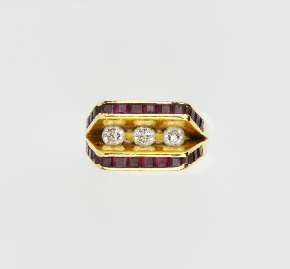 ANELLO IN ORO GIALLO, DIAMANTI E RUBINI disegnato come una doppia montatura speculare di forma geometrica decorata al centro da tre diamanti taglio brillante rotondo per ct 0.60 circa, i profili impreziositi da rubini carré, PUNZONE 750 Stato di conservazione complessivo ottimo. DIAMOND, RUBY AND YELLOW GOLD RING Overall excellent conditions.