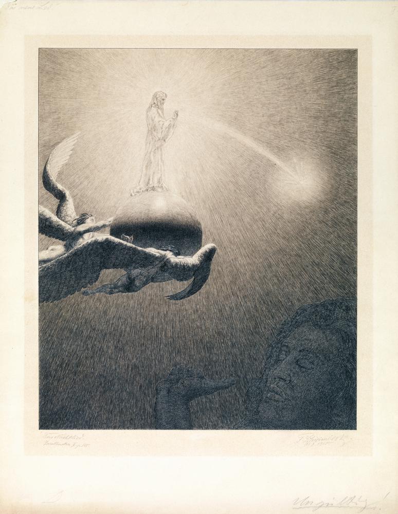 Fritz Schwimbeck DAS NACHTLIED. 1916 Penna e inchiostro di china. mm 330x279. Foglio: mm 445x350. Firamato a matita in basso a eestra e datato “8.X.1916”. Iscritto in basso a sinistra a matita “Das Nachtlied. Zarathustra II.p.155” e in alto a sinistra “Das neue Lied”.