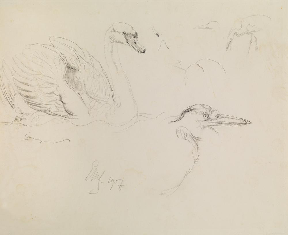 Ernst Moritz Geyger COPPIA DI DISEGNI Studi di cigno e aironi. Matita di...