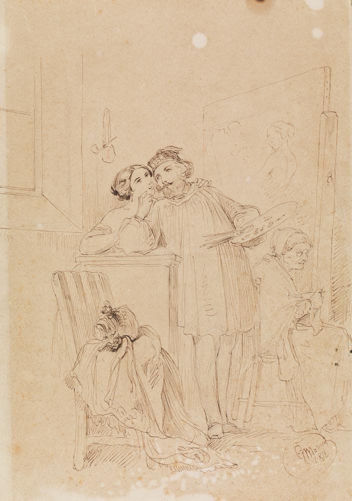 Lot 459 | Giuseppe Moricci ARTISTA, MODELLA E ANZIANA SIGNORA NELL’ATELIER Penna e...