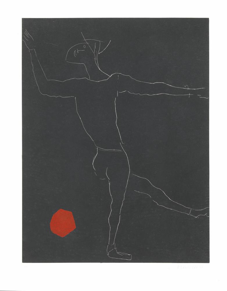 Marino Marini GIOCO II. 1973 Acquaforte e acquatinta a colori. mm 645x490. Foglio: mm 990x700. Guastalla, A167. Firmata a matita e annotata “P.A.”. Da “Personaggi”, serie di 6 incisioni eseguite nel 1973, pubblicata a Torino nel 1974 da Albra e stampate dalla Stamperia Il Cigno di Roma. Tiratura a 25 esemplari numerati a numeri arabi e 25 a numeri romani più 12 prove d’artista. Ottima impressione stampata su carta Magnani Pescia recante in basso a destra il timbro a secco della stamperia. Margini editorali, lieve ingiallimento all’estremo bordo sinistro con piccoli strappi marginali.