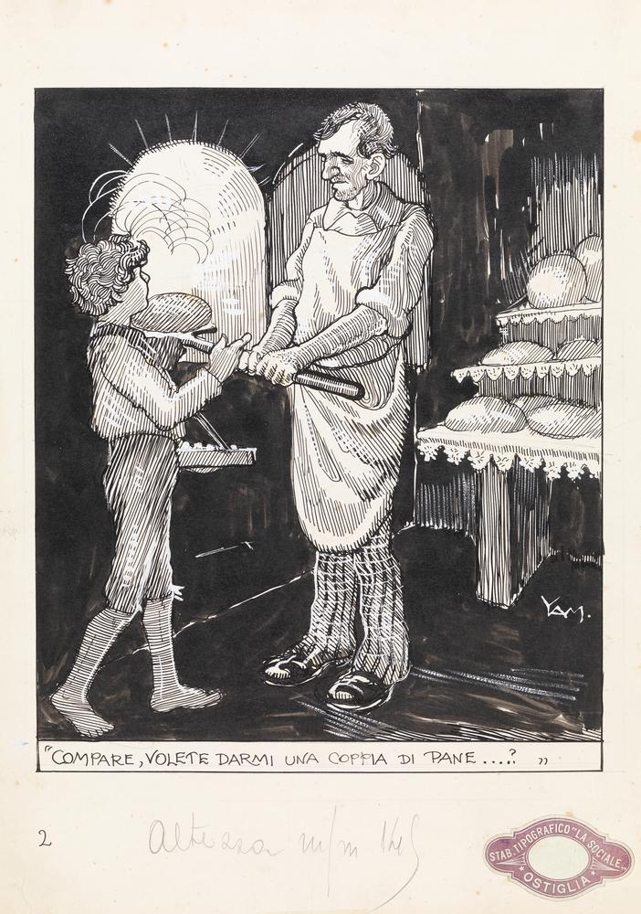Yambo [pseud. di Enrico dè Conti Novelli da Bertinoro] (1876 –1943) COMPARE, VOLETE DARMI UNA COPPIA DI PANE … ? Penna e inchiostro di china e rialzi a tempera bianca su cartoncino avana liscio. mm 241x200. Foglio: mm 335x250. Firmato a tempera bianca. Al verso etichetta dello Stabilimento Tipografico “La sociale” di Ostiglia. €