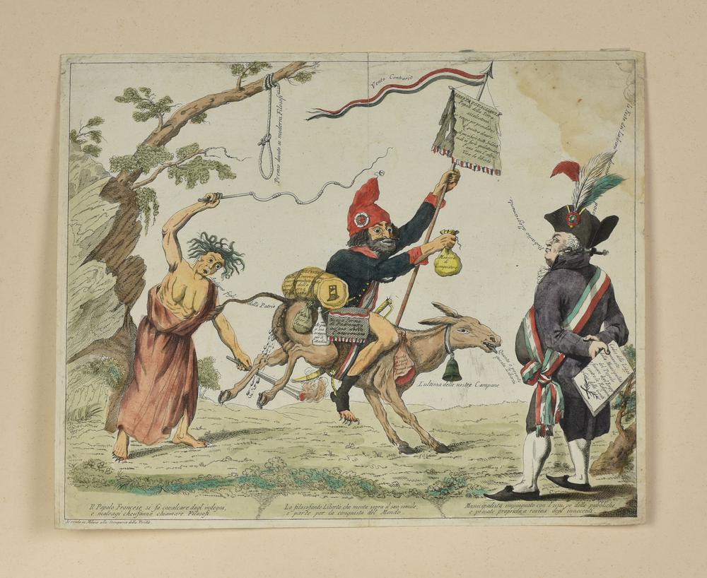 Artista italiano del XVIII secolo STAMPA SATIRICA Acquaforte acquarellata. mm 312x395. Bella impressione e bella colorazione. Sottile margine oltre l’impronta della lastra, piega centrale verticale e alone di umidità all’angolo superiore destro.