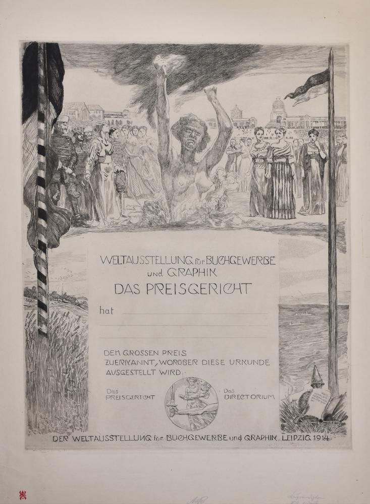 Max Klinger BUGRA EHRENURKUNDE. 1915 Acquaforte. mm 570x455. Foglio: mm 720x545. Firmata a matita e datata “13.1.15”. Annotazione autografa a matita “2.Z.1.Dr”. Beyer 421. Rara prova nel II stato su 5. Grandi margini intonsi. Timbro della collezione Stinnes (Lugt 1376a). Ottima conservazione.
