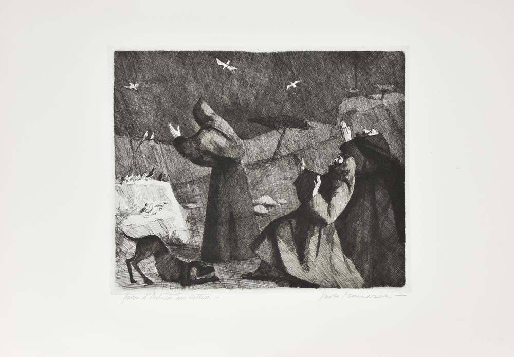Paolo Manaresi PREDICA AGLI UCCELLI. 1951 Acquaforte. mm 295x365. Foglio: 405x645 Prova d’artista avanti lettera firmata a matita. Pallucchini 76.