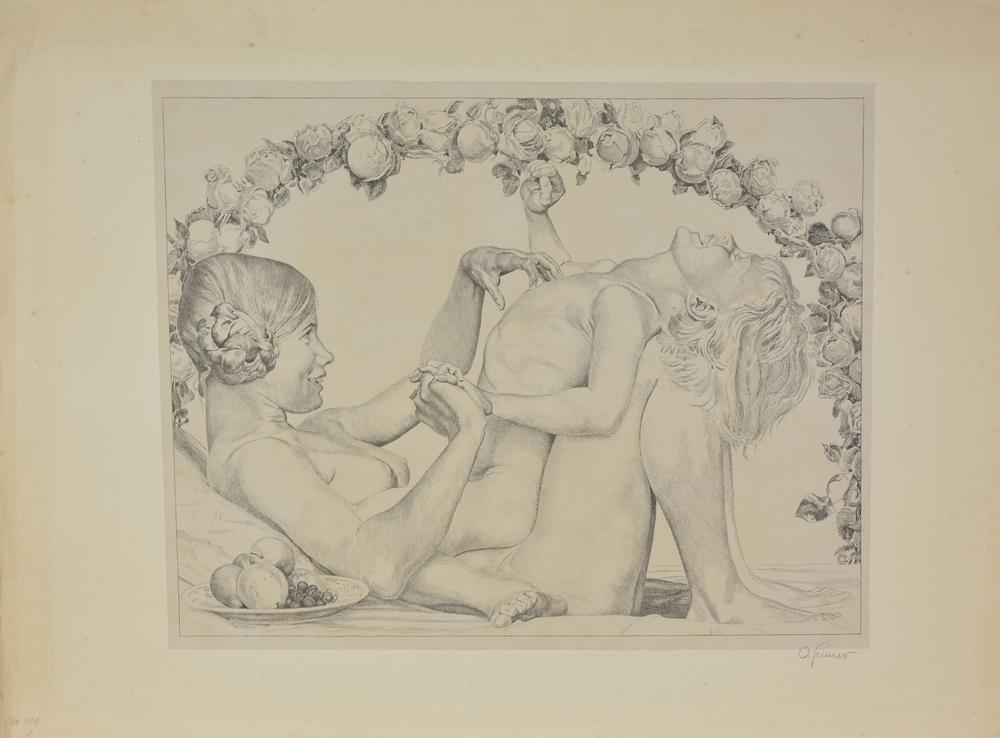 Otto Greiner KRIEGSKINDER (LEBENSFREUDE) Litografia a penna. mm 395x510. Foglio: 560x780. Firmata a matita e monogrammata sulla pietra. Vogel 111 Bellissima prova nello stato unico stampata su carta China applicata. Grandi margini. Lievi strappi e pieghe alle estremità dei margini destro e sinistro.