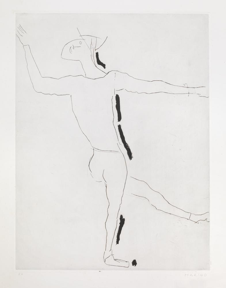 Marino Marini GIOCO I. 1973 Acquaforte e puntasecca. mm 645x490. Foglio: mm 990x700. Guastalla, A166. Firmata a matita e annotata “P.A.”. Da “Personaggi”, serie di 6 incisioni eseguite nel 1973, pubblicata a Torino nel 1974 da Albra e stampate dalla Stamperia Il Cigno di Roma. Tiratura a 25 esemplari numerati a numeri arabi e 25 a numeri romani più 12 prove d’artista. Ottima impressione stampata su carta Magnani Pescia recante in basso a destra il timbro a secco della stamperia. Margini editorali, lieve ingiallimento e traccia di ossidazione al margine sinistro.