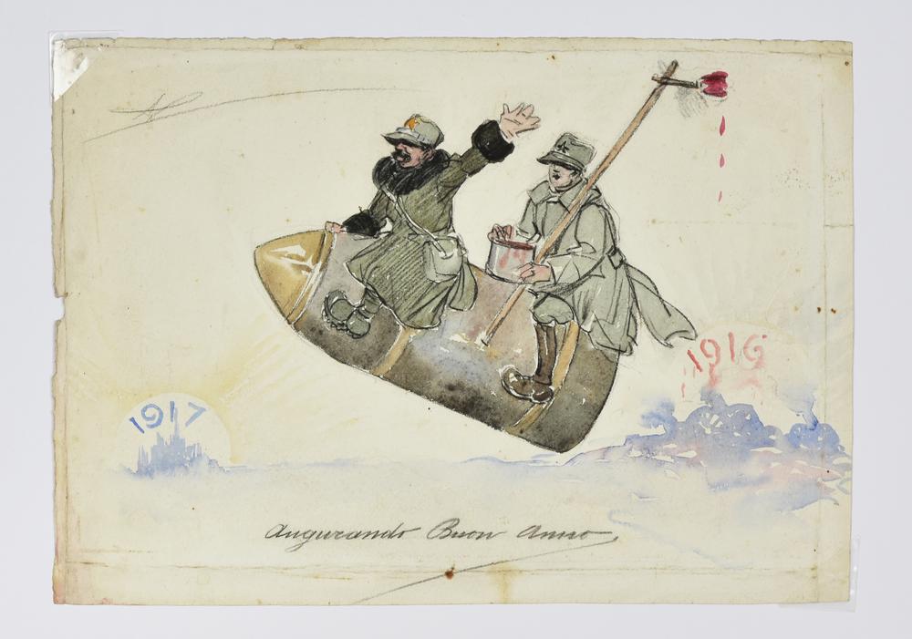 llustratore italiano del XX secolo BOZZETTO PER UN BIGLIETTO AUGURALE PER IL NUOVO ANNO. 1916/17 Gessetto nero e acquerello policromo. mm 220x320. Al verso annotazione “Amalia Bonamico Verona”