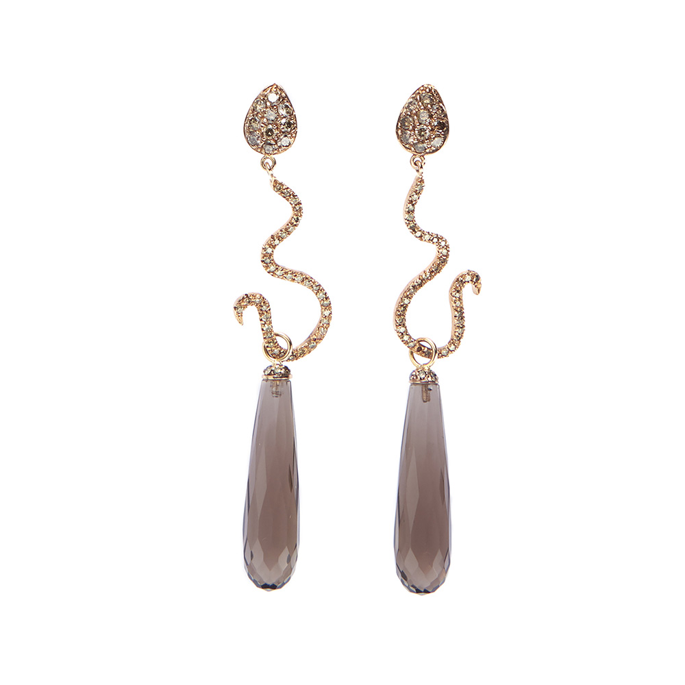 Orecchini in oro rosso 18kt A serpente, con grandi gocce di topazio fumè...
