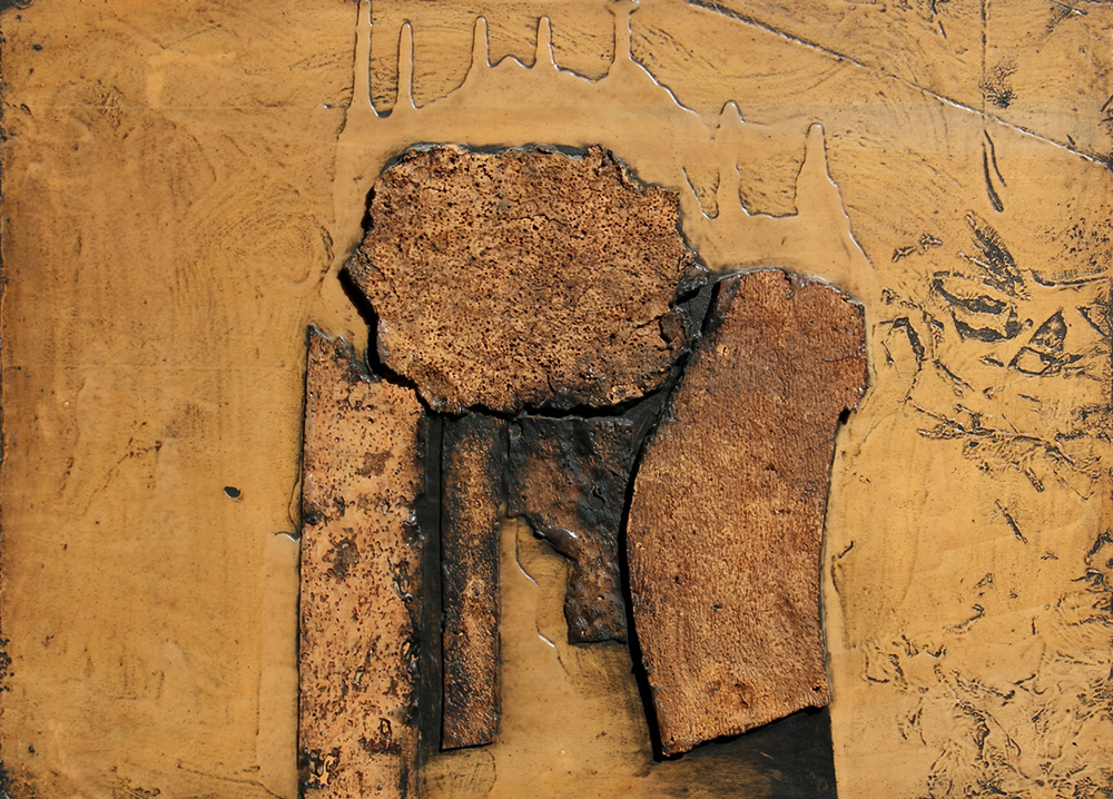 Roberto CRIPPA (Monza 1921-05-07 Bresso 1972-03-19) Mimetisme de la conscienze 1960 collage e sugheri su tavola cm. 50 x 70Firma, data, titolo "R. Crippa, 1960, Mimetisme de la conscienze"; etichetta della Galleria Schwarz, Milano (al retro)