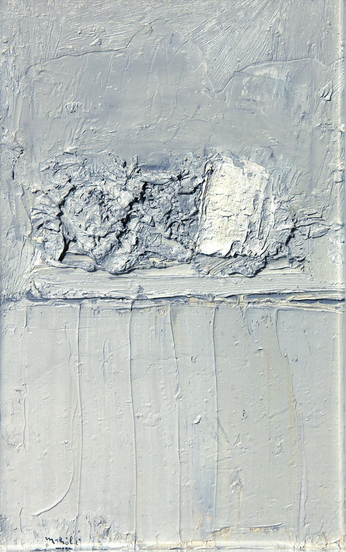 Carlo MATTIOLI (Modena 1911-05-08 Parma 1994-07-13) Natura morta 1965 olio su tela cm. 50 x 30Firma "Mattioli" (in basso a sinistra) Firma, data, titolo, firma, data "Mattioli, 65, Natura morta grigia, Mattioli, 1965" (al retro)