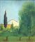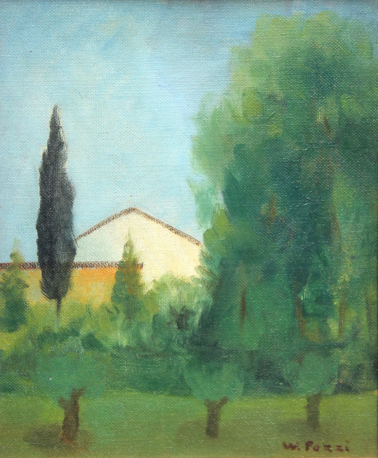 Walter POZZI (Bergamo, 1911 Milano, 1989) Paesaggio 1950 olio su tela applicata su tavola cm. 45 x 35Firma "W. Pozzi" (in basso a destra) Scritta, luogo, data, firma "Questo paesaggio è stato dipinto da me nel 1950, Milano, 17.2.71, Walter Pozzi"; timbro dell'esposizione, Palazzo Reale, Milano 1975 (al retro)
