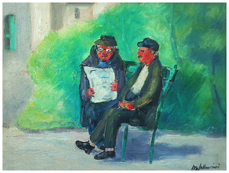 ANGELO SIRIO PELLEGRINI Livorno 1908 – Livorno 1997 La panchina Olio su tela cartonata 30 x 40. Firma in b. a d.; sul verso titolo e firma + timbro studio dell’artista. base: 50