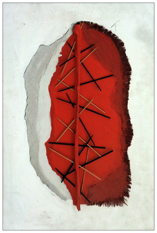 LUIGI BONI Cerbaiola 1904 – Castelfiorentino 1977 Senza titolo Olio, applicazioni in legno e collage di cartone e juta su faesite 60 x 40. Firma sul verso. base: 100