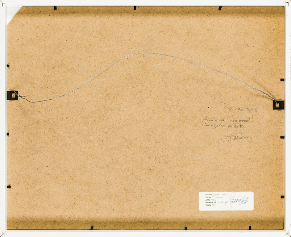 Dedica ad personam ed etichetta dell'Artista con caratteristiche tecniche dell'opera e firma al retro della tavola protettiva