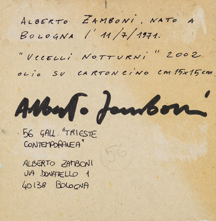 ALBERTO ZAMBONI (1971)Uccelli notturni, 2002Olio su cartoncinocm 15x15Firma...