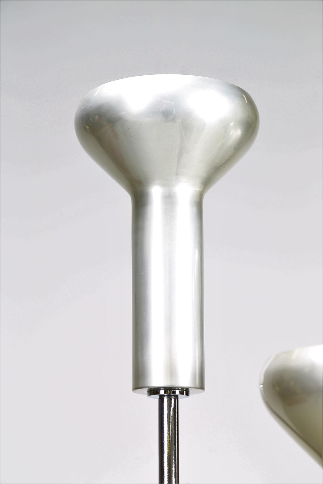 SARFATTI GINO (1912 - 1985) Three Lamps mod. 1073. . . Chrome, aluminium and painted metal. For Arteluce, 1956. Lamp size: High: H 208 W 25 D 25 Medium: H 198 W 25 D 25 Small: H 181 W 25 D 25