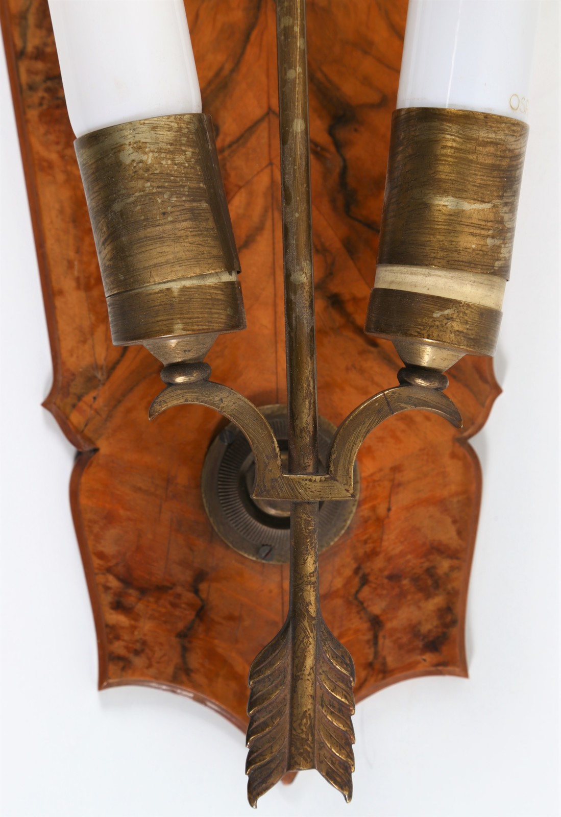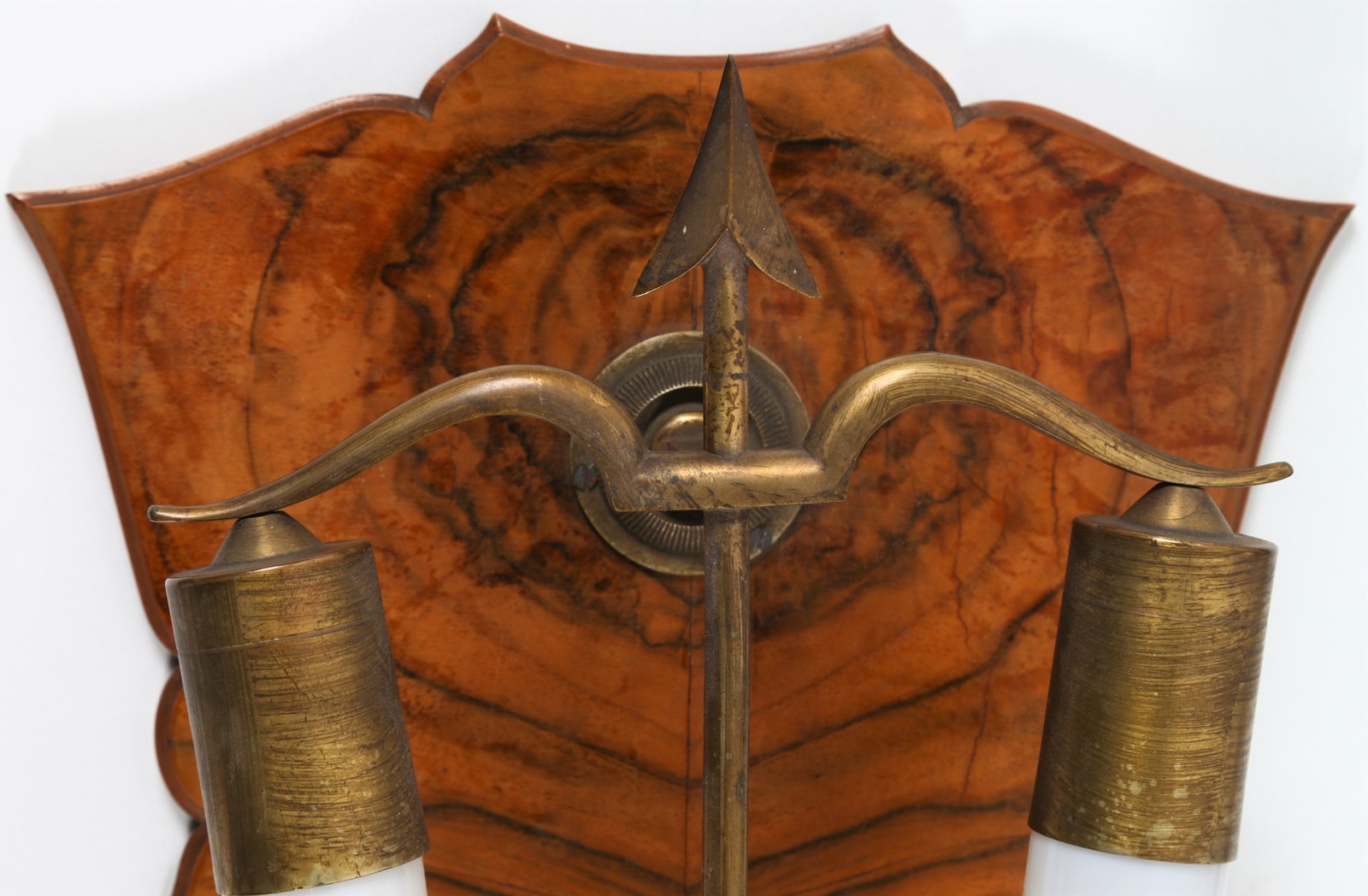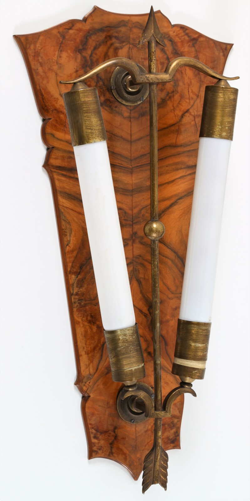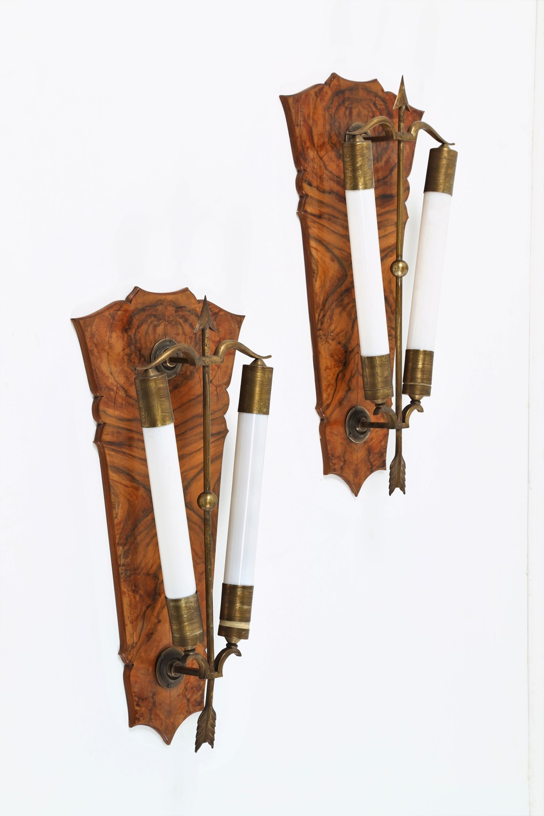 PONTI GIO' (1891 - 1979) Attrib. Coppia di lampade da parete. -. Cm 28,00 x 59,00 x 11,00. Radica ferrarese e ottone, anni 30