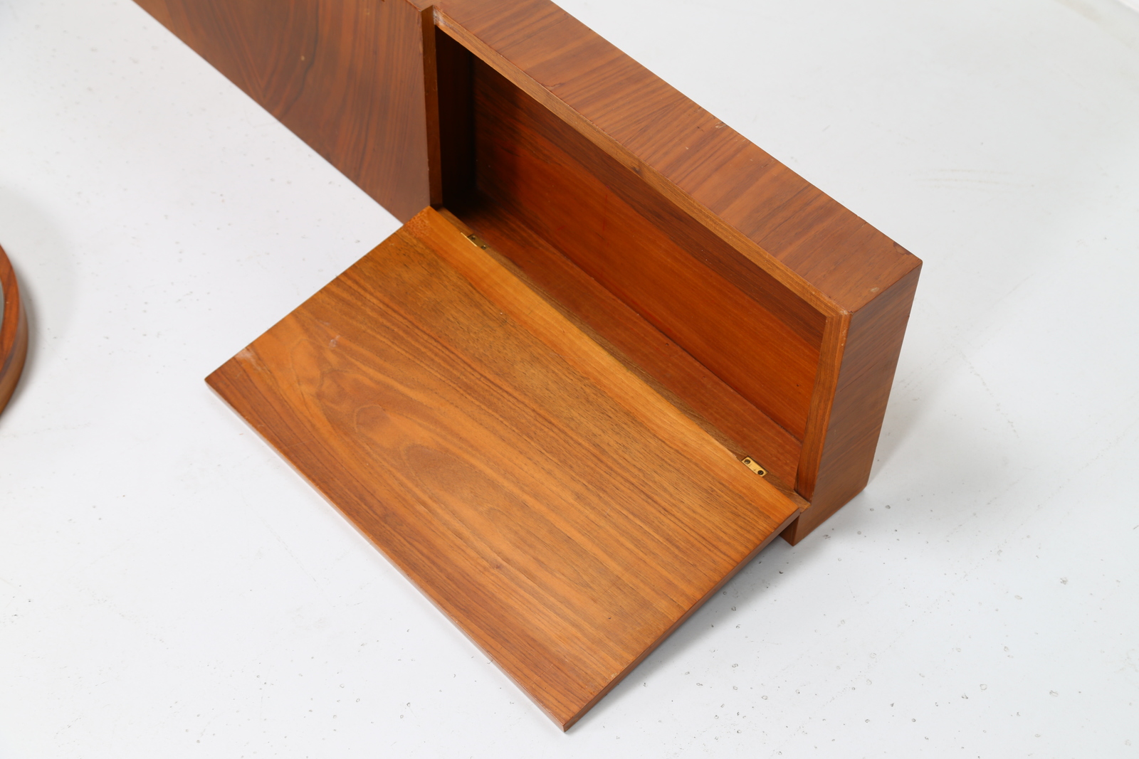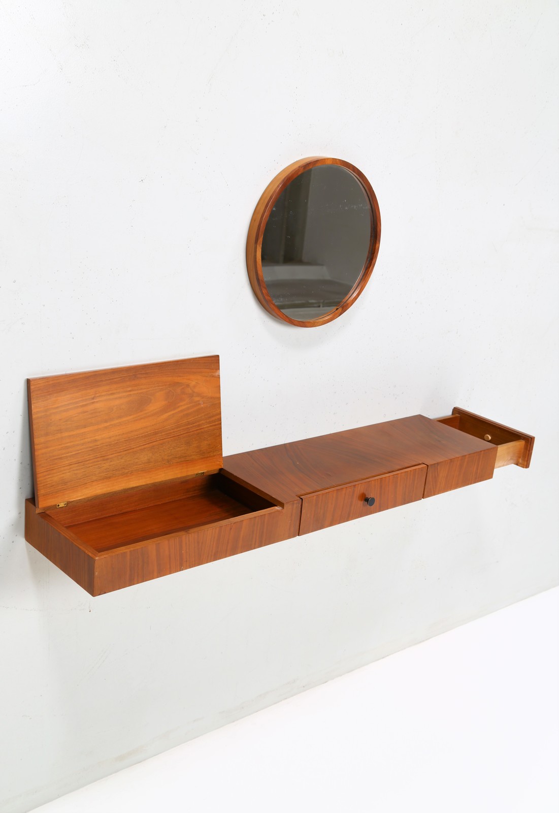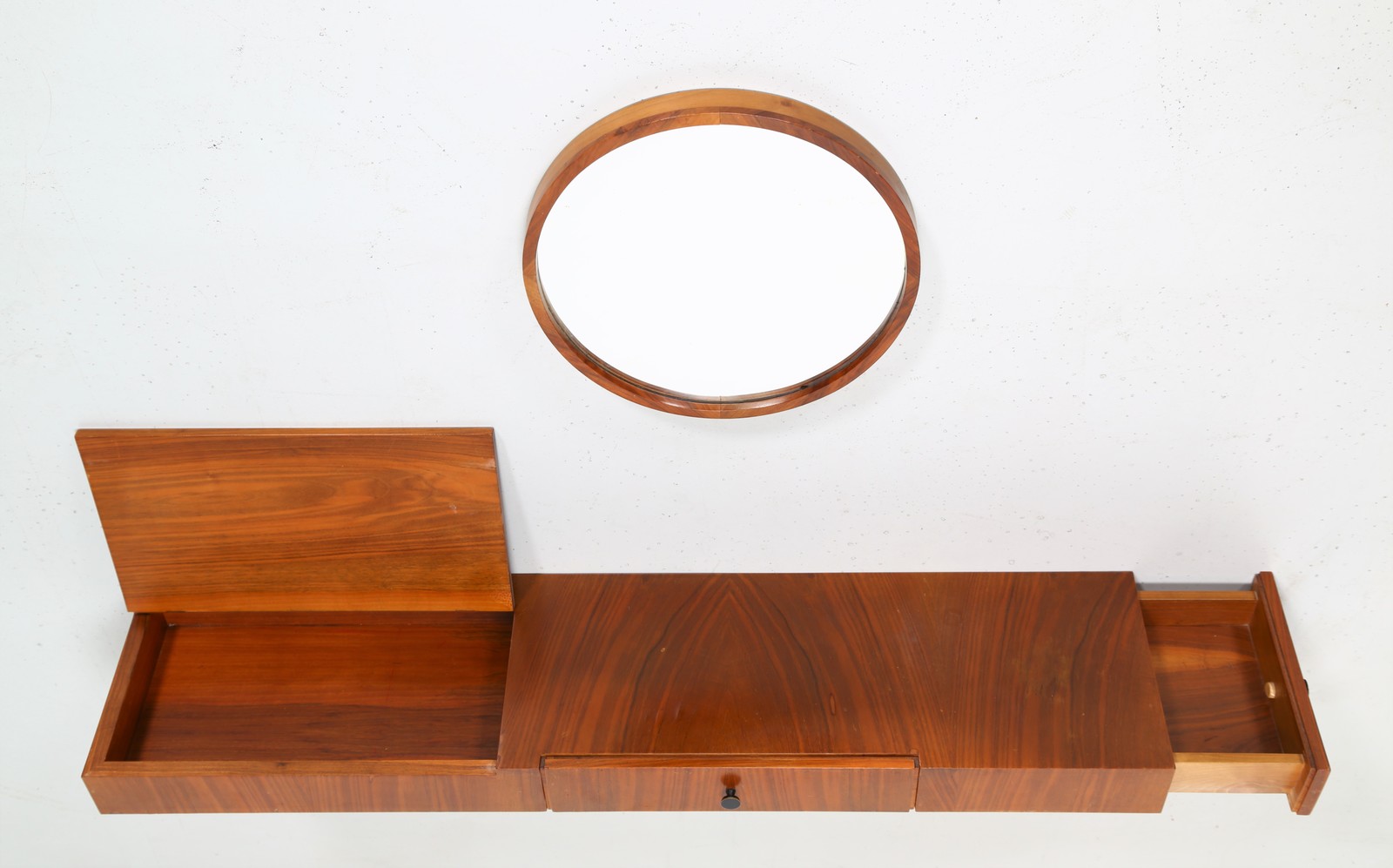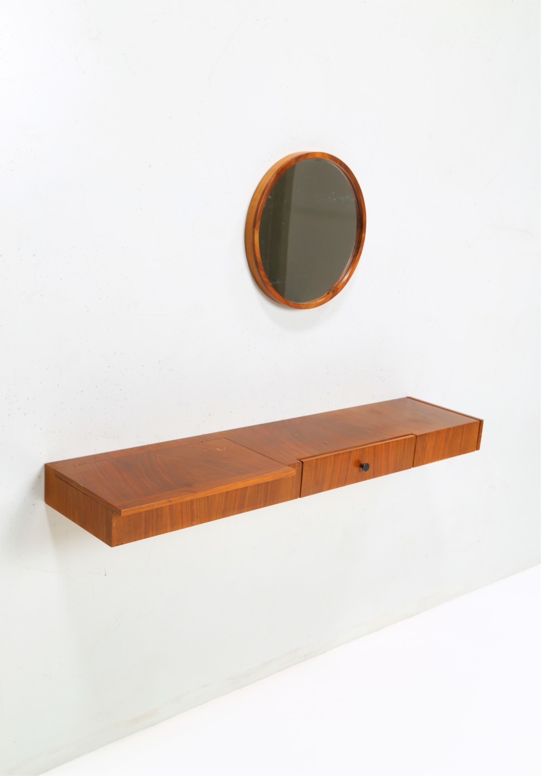 GIOVANNI BATTISTA BASSI Consolle sospesa con specchio. -. Cm 132,00 x 15,00 x 40,00. Legno di noce, metallo e vetro, anni 50, per arredo in Firenze.