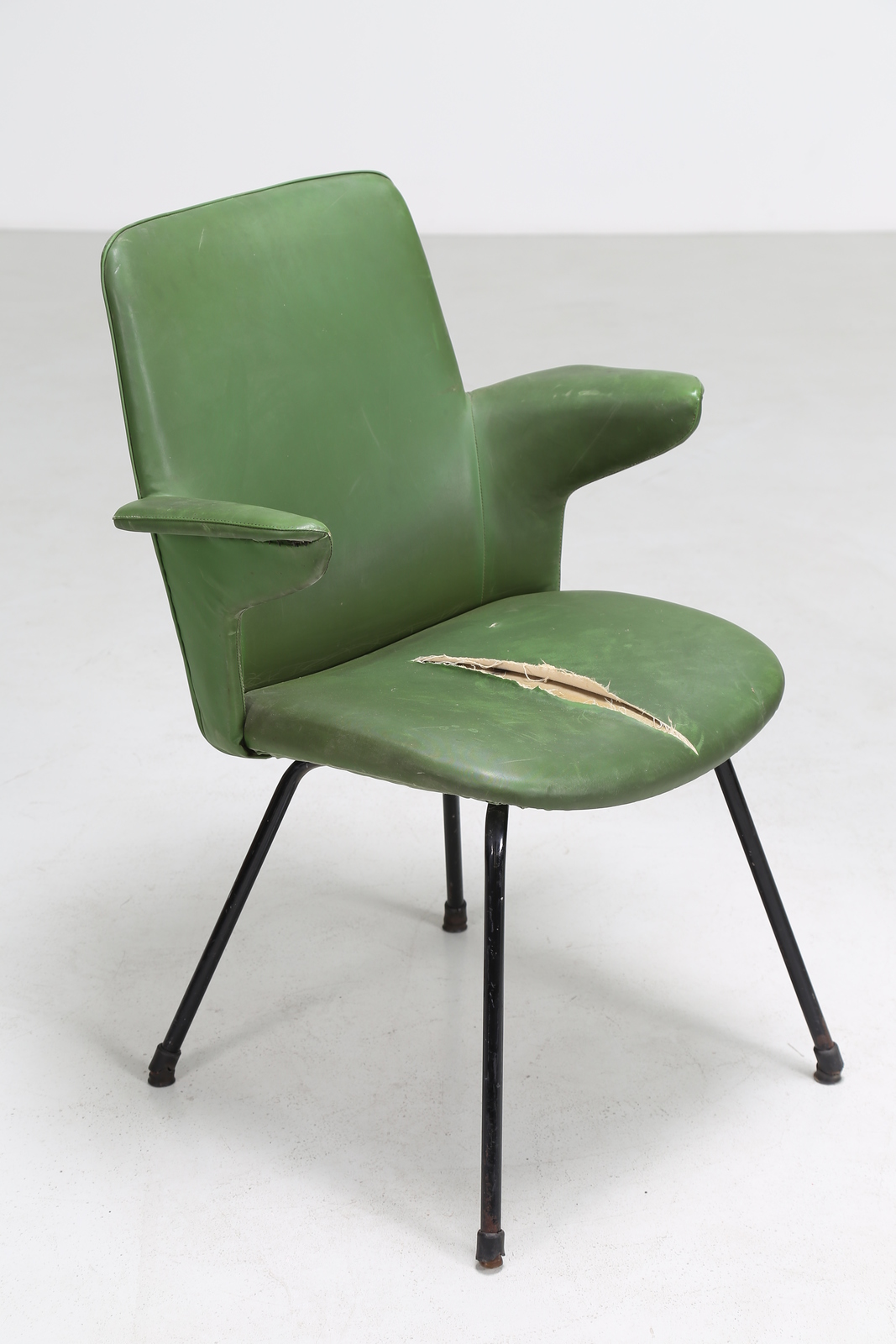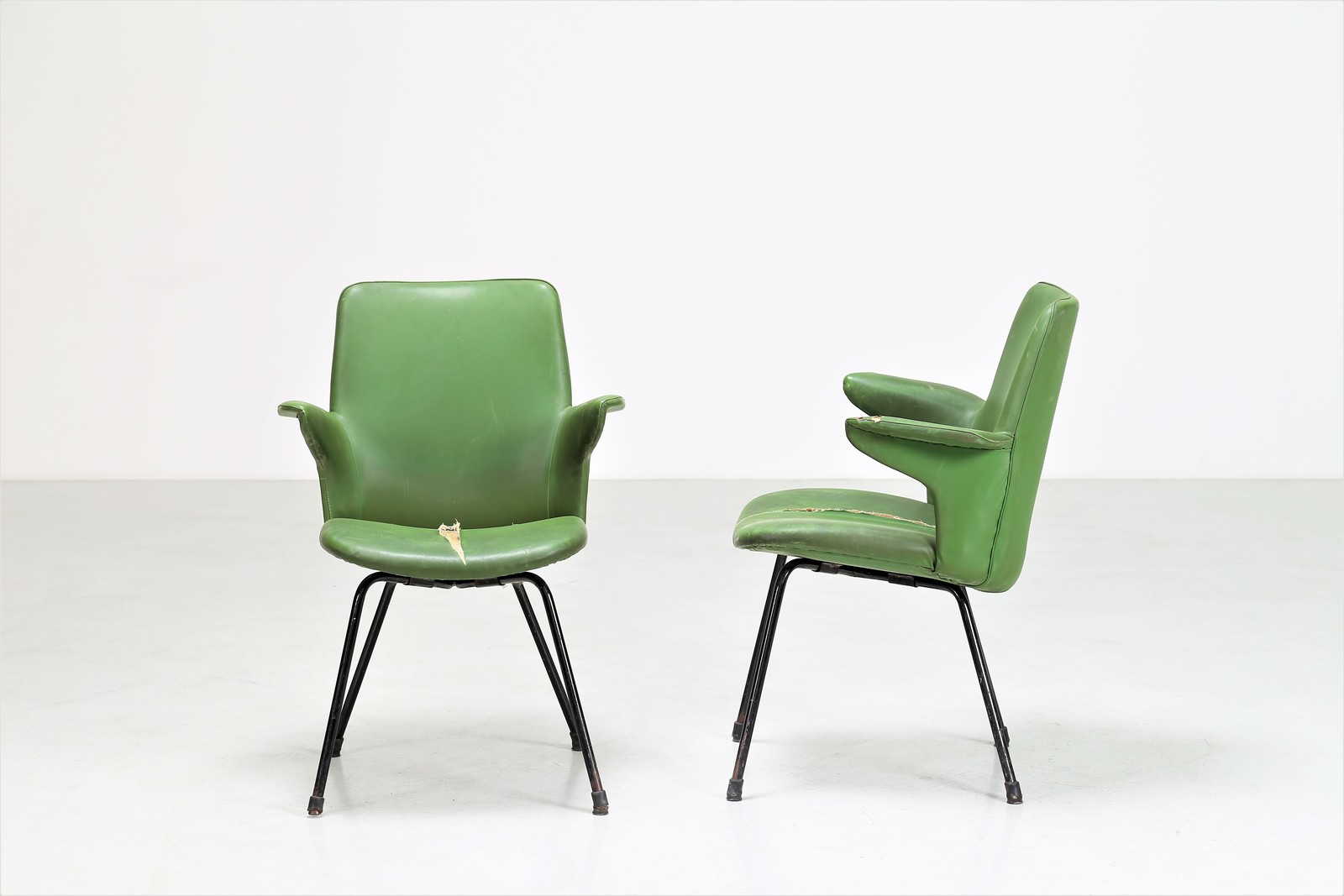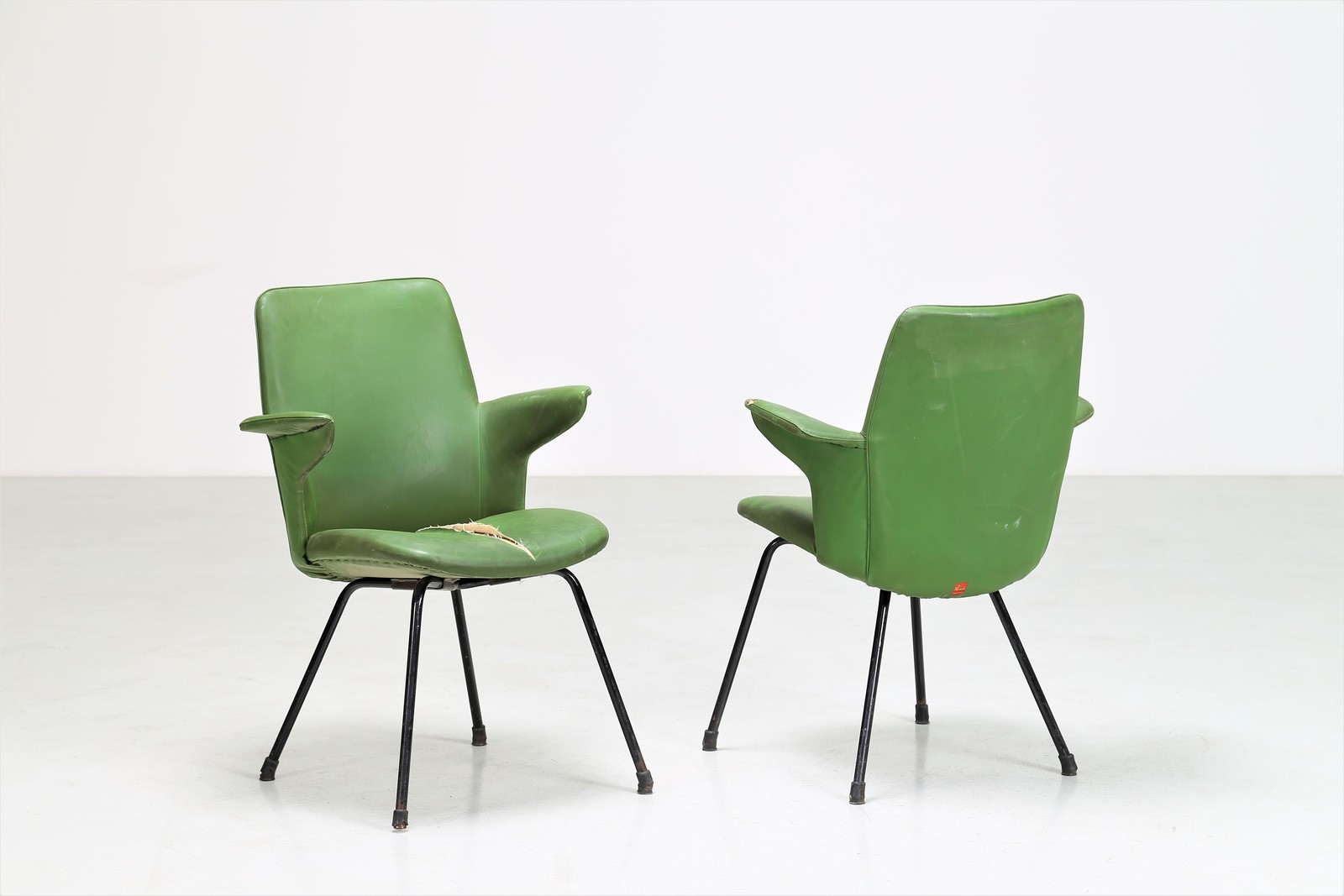 RINALDI GASTONE Coppia di poltroncine DU 20. -. Cm 60,00 x 82,00 x 60,00. Scocca in lamiera, multistrato e rivestita in gommapiuma Pirelli e sky, per Rima anni 50. Pubblicazione: Gastone Rinaldi Designer alla Rima a cura di Giuseppe e Jacopo Drago, pag. 177