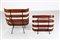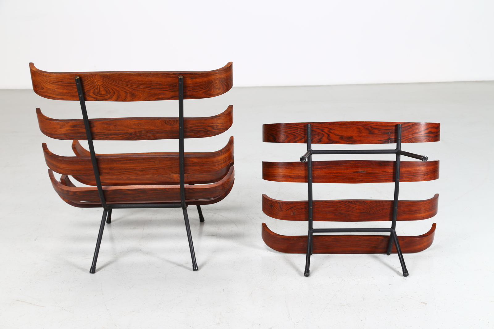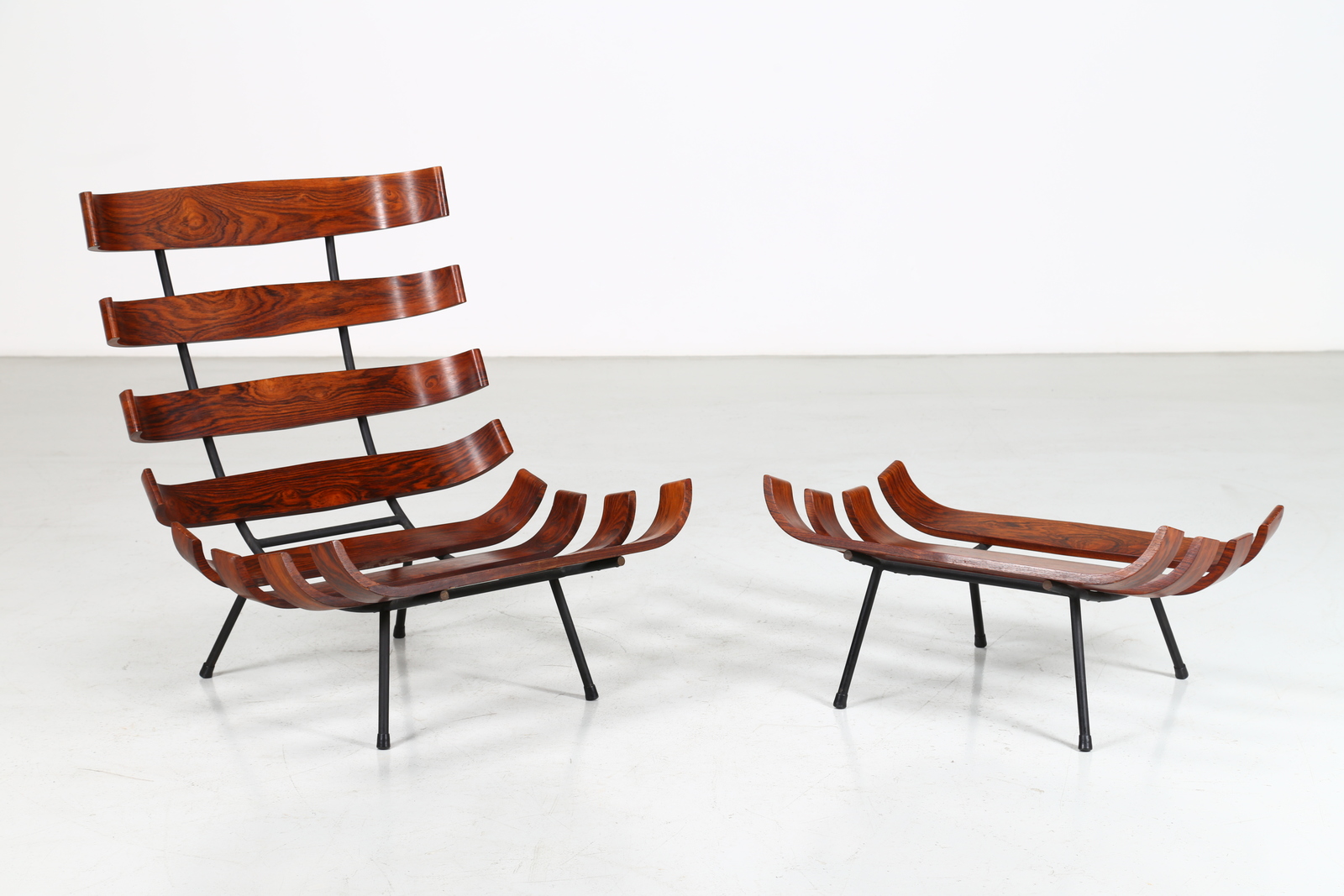 CARLO HAUNER (1927-1997) & MARTIN HESLER (1913-1977) Poltrona e pouf. -. Cm 70,00 x 81,00 x 80,00. Struttura in ferro verniciato e compensato curvato di teak, per FORMA, 1960. Pubblicazioni; Domus 362 (gennaio 1960), pubblicità.