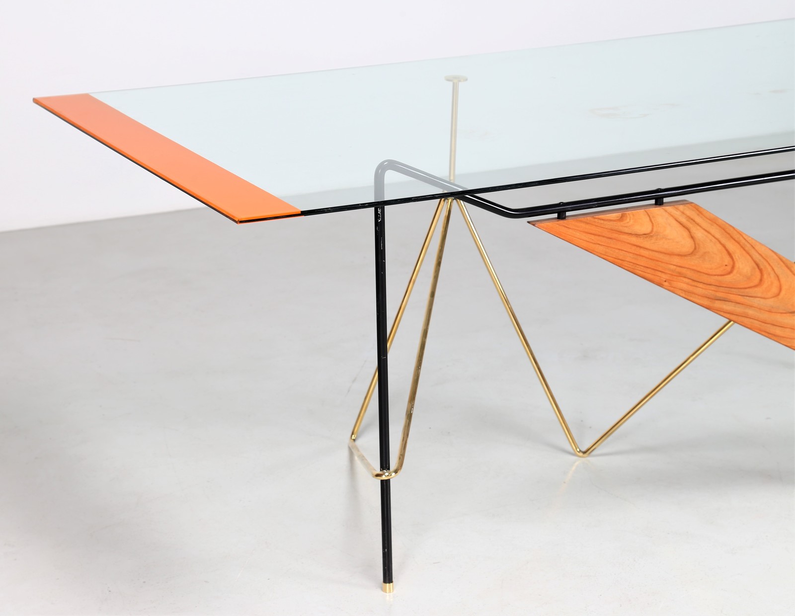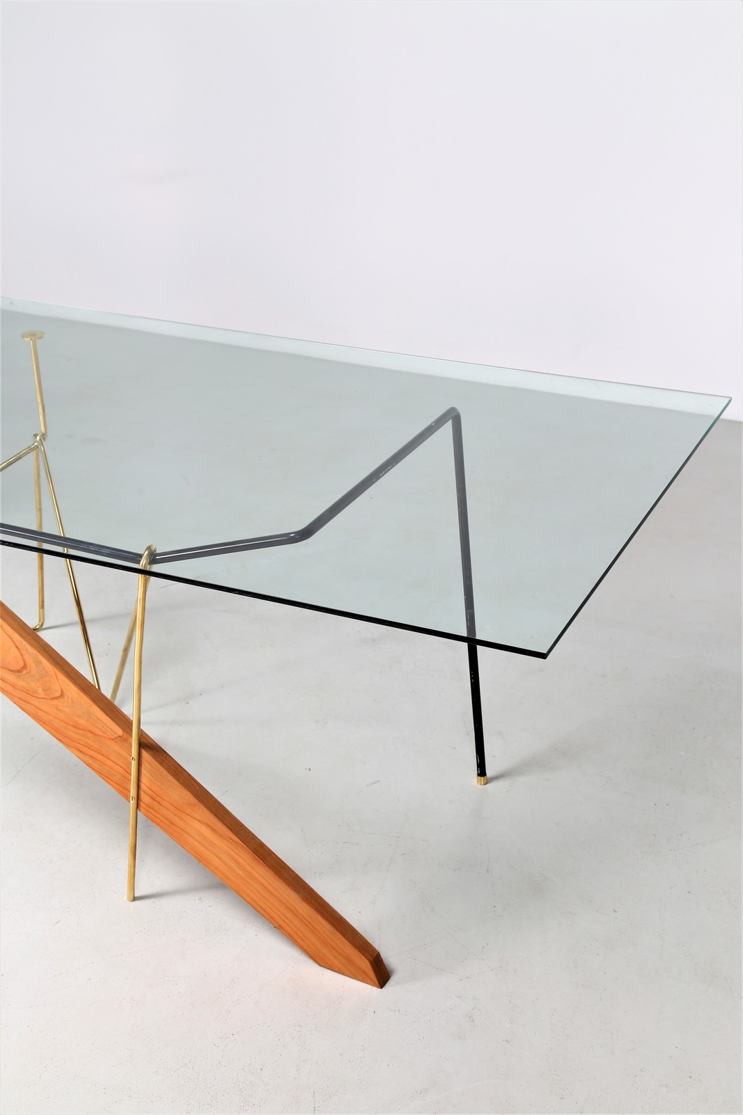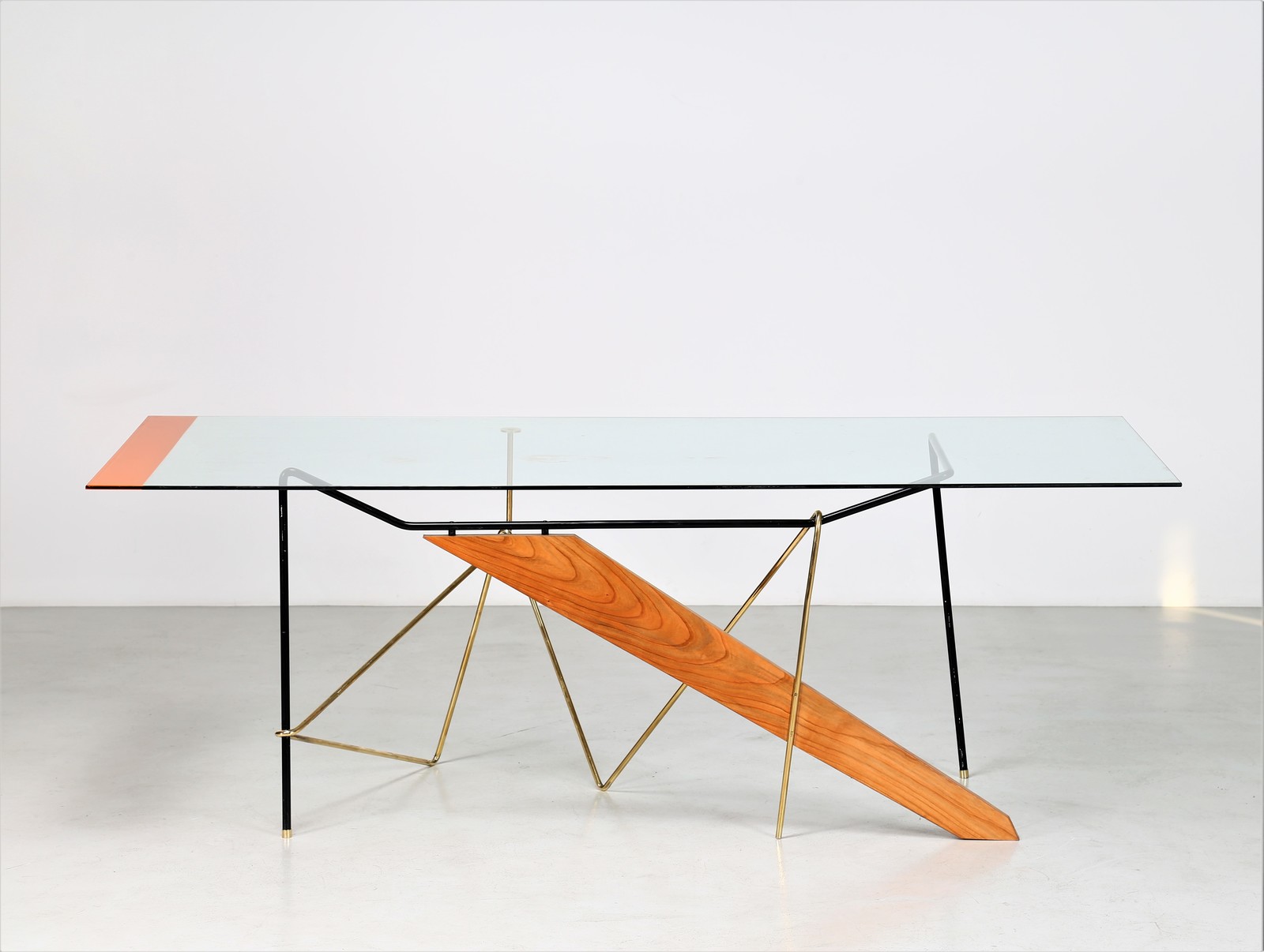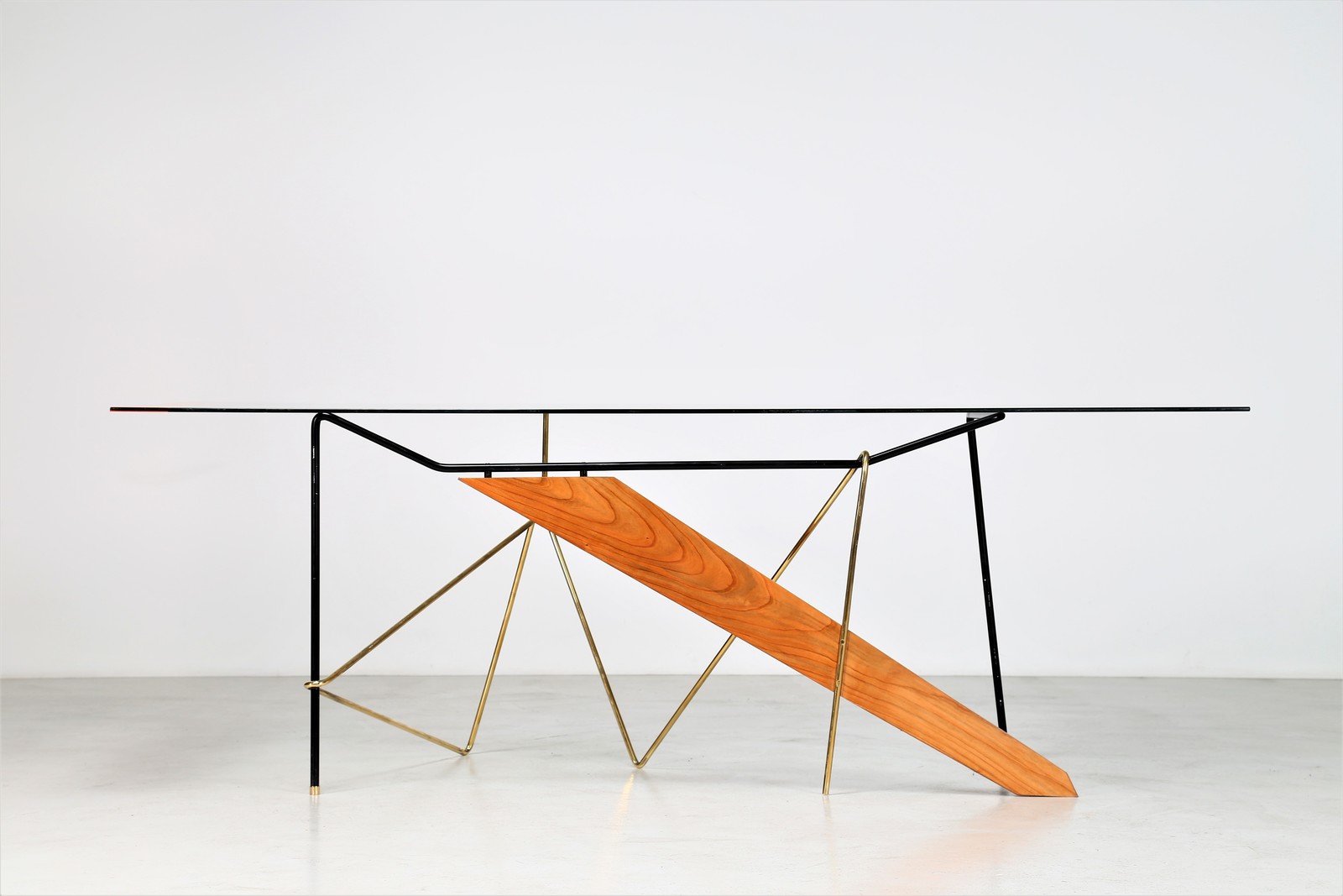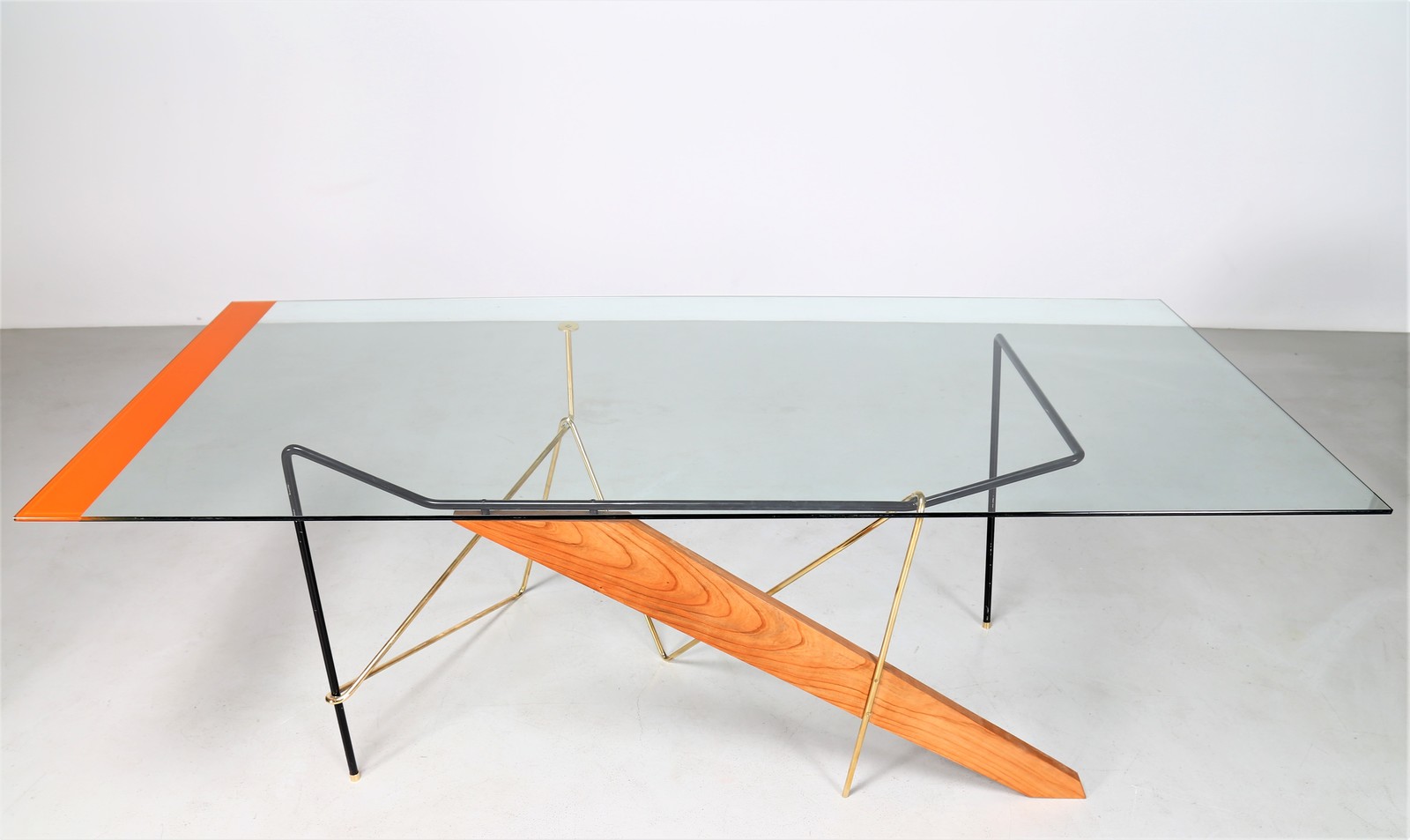 PILLANT MORDECAI Table. . Cm 198,00 x 74,00 x 90,00. Lacquered metal, wood and brass, glass top, mod. Dalmatia, unique specimen 2017