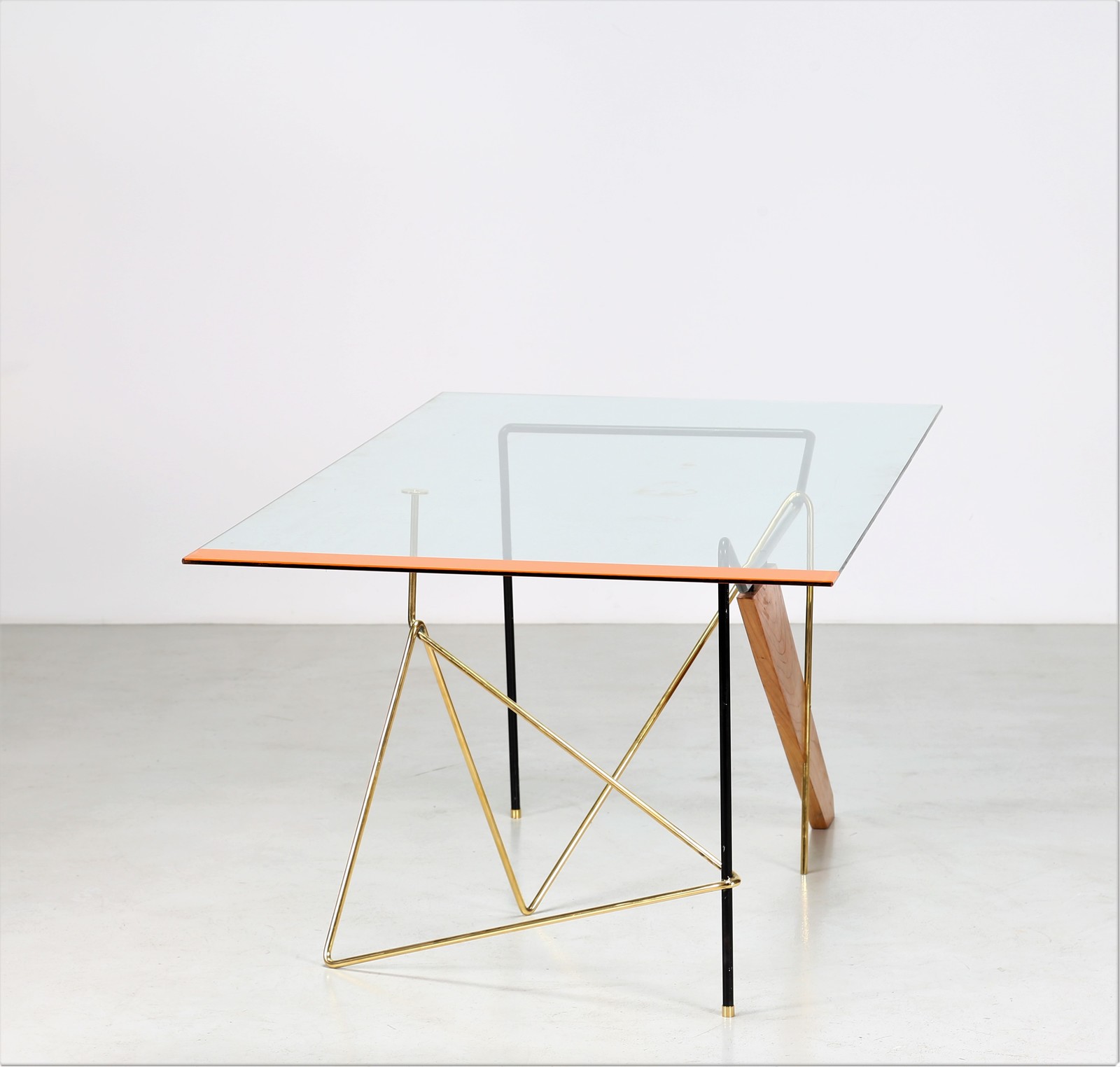 PILLANT MORDECAI Tavolo . -. Cm 198,00 x 74,00 x 90,00. Metallo laccato, legno e ottone, Piano in cristallo, mod. Dalmazia, esemplare unico 2017