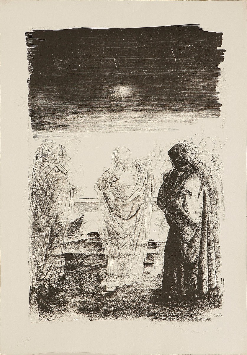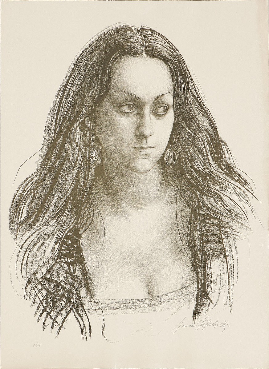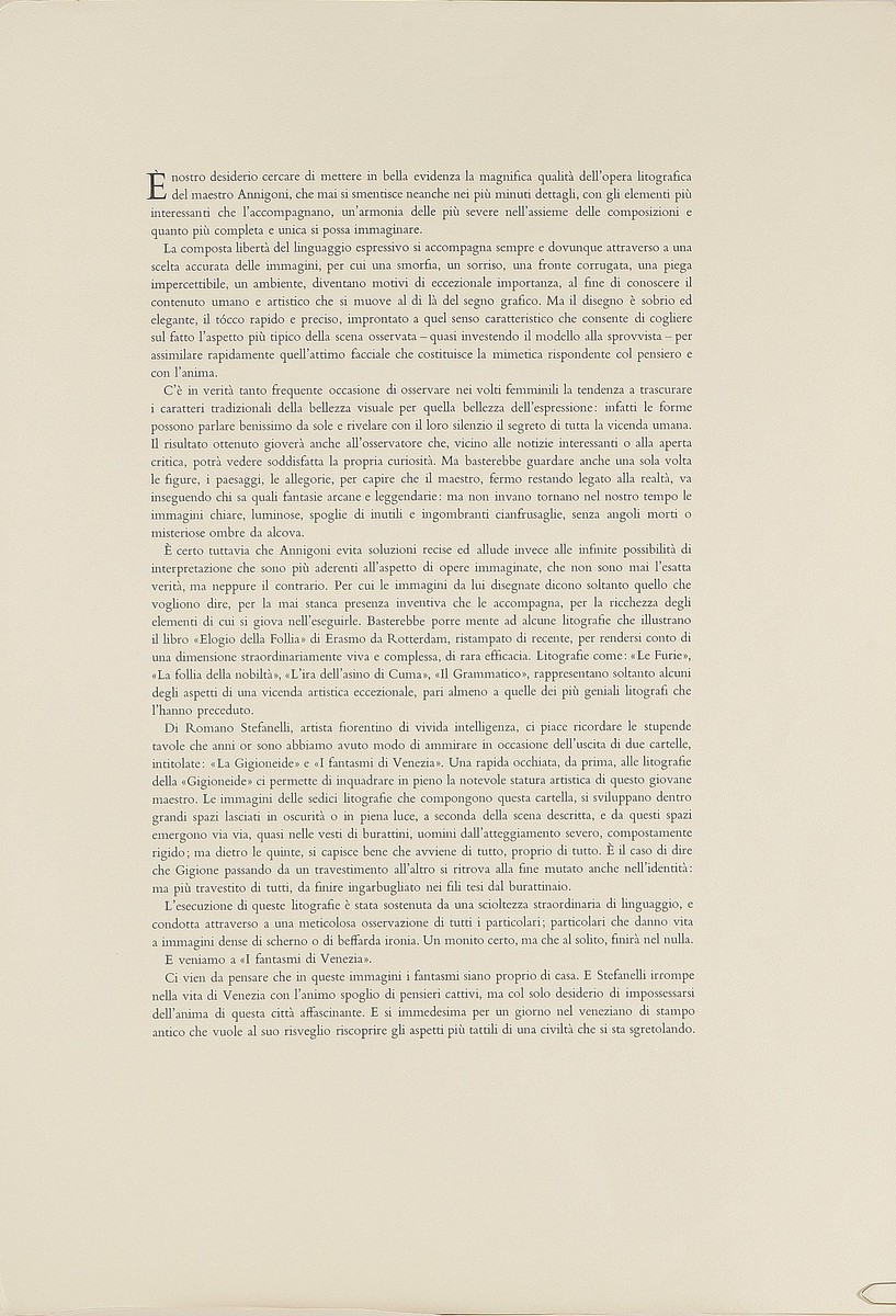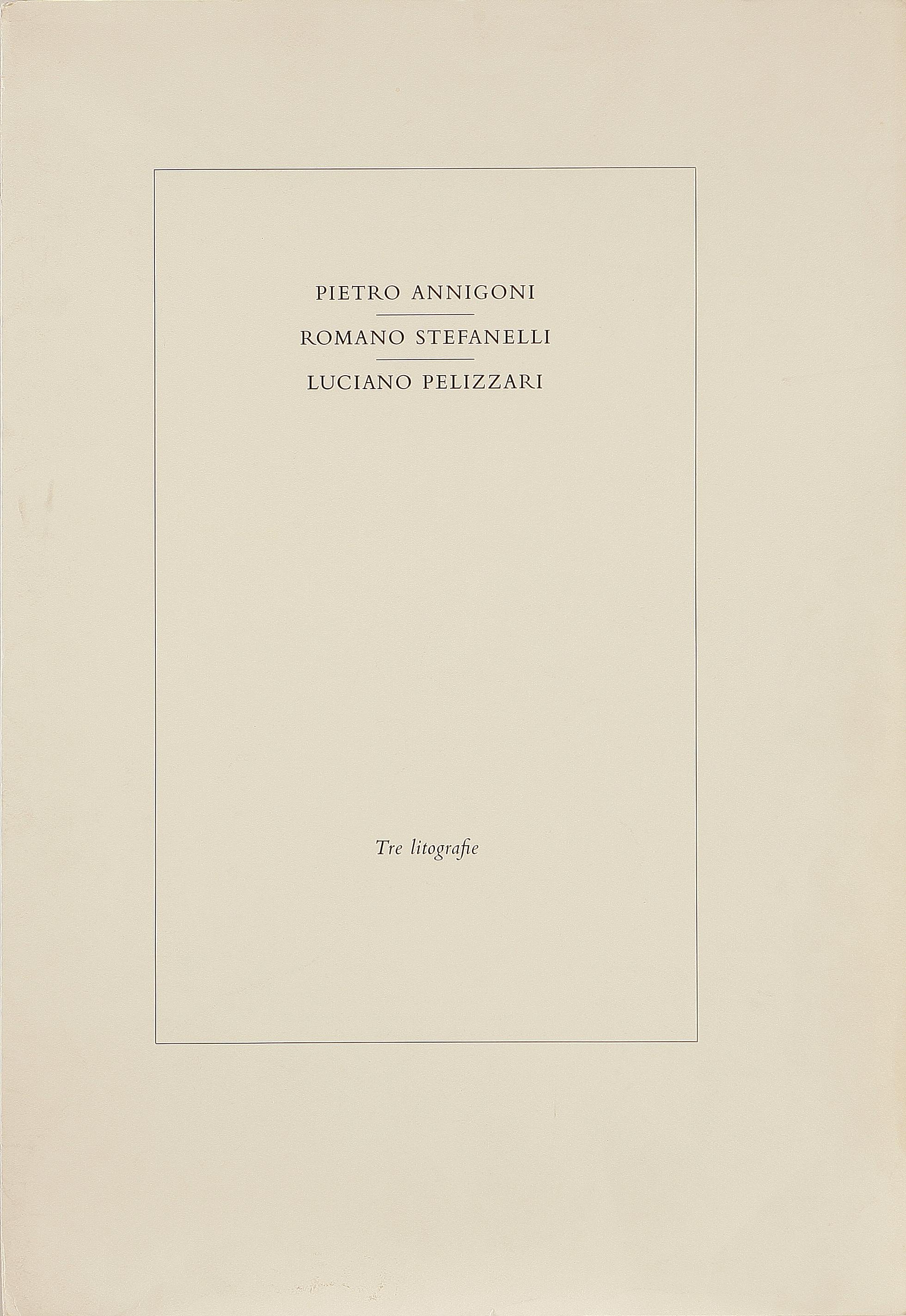 AUTORI VARI Romano Stefanelli, Pietro Annigoni e Luciano Pellizzari Tre litografie. 1978. Portfolio. Cm 50x70. Le tre litografie sono contenute in una cartella tirata in 125 esemplari del novembre del 1978. Misure disegno: 1)58x40; 2)61x48; 3)56x37. Annigoni: firma a matita in basso a destra, Tir. 24/125; Stefanelli: Firma a matita in basso a destra, Tir.38/99; Pellizzari: Firma in basso a destra a matita, Tir. 24/129.