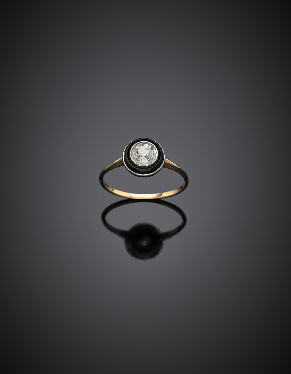 Anello in oro giallo e bianco con onice a contornare un diamante di ct. 0,52...