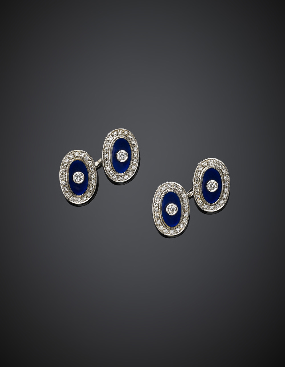 White gold diamond and blue enamel oval cufflinks, g 11.55, diam. cm 1.7x1.1.