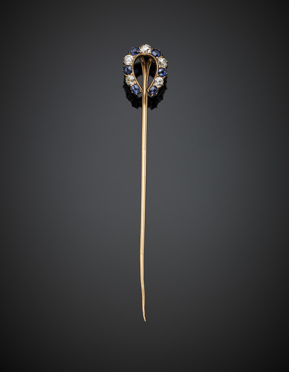 Diamond in all ct. 0.50 circa and sapphire in all ct. 0.90 circa yellow gold tie pin, g 3.55, width cm 8, h cm 1.2 circa.
