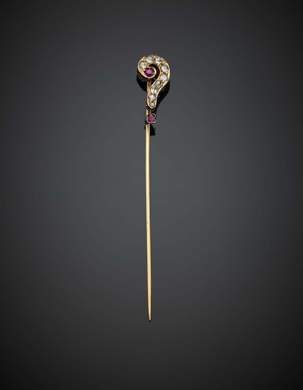 Yellow gold diamond and ruby question mark tie pin, g 2.56, width cm 7.4, h cm 0.7 circa.