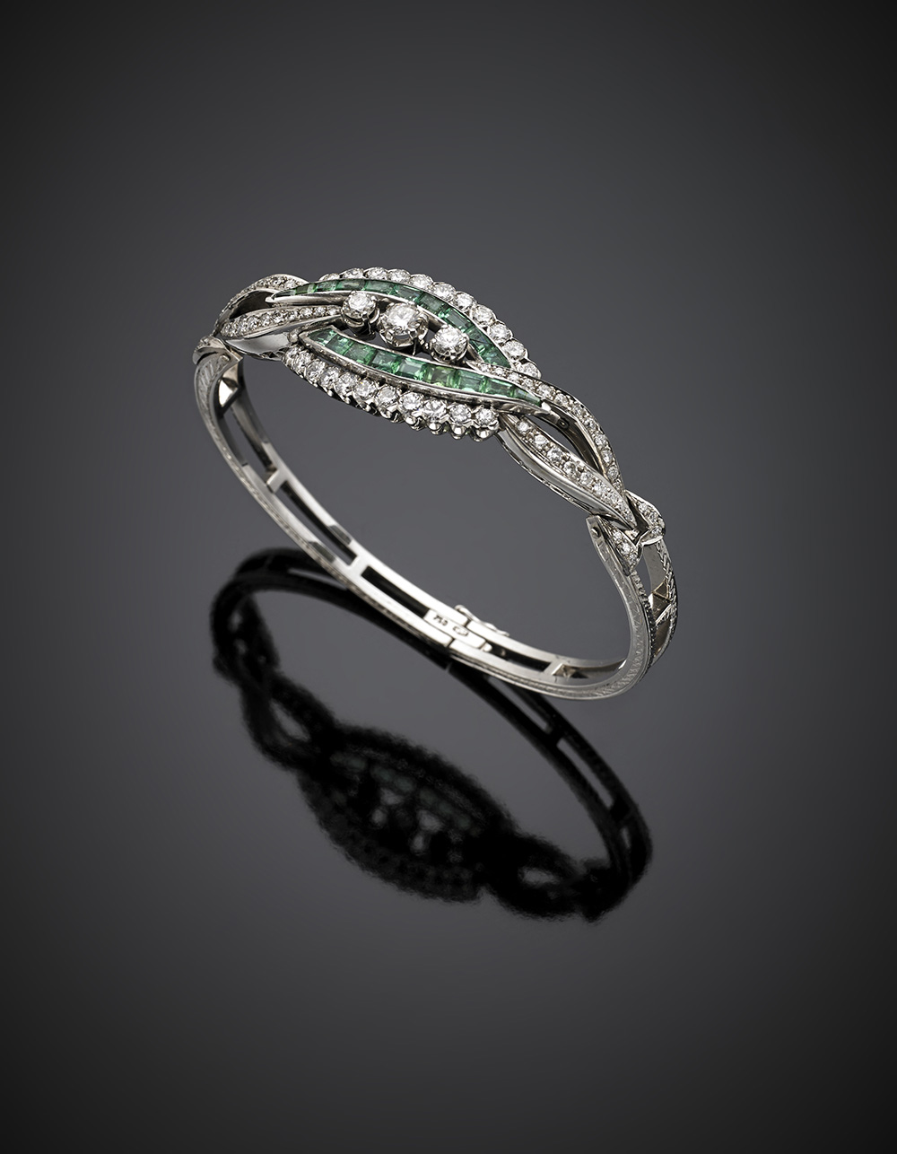 Bracciale rigido in oro bianco con diamanti per complessivi ct. 8 circa e smeraldi per complessivi ct. 3,50 circa g 35,50, diam. cm 6. Marcato 21 MI.