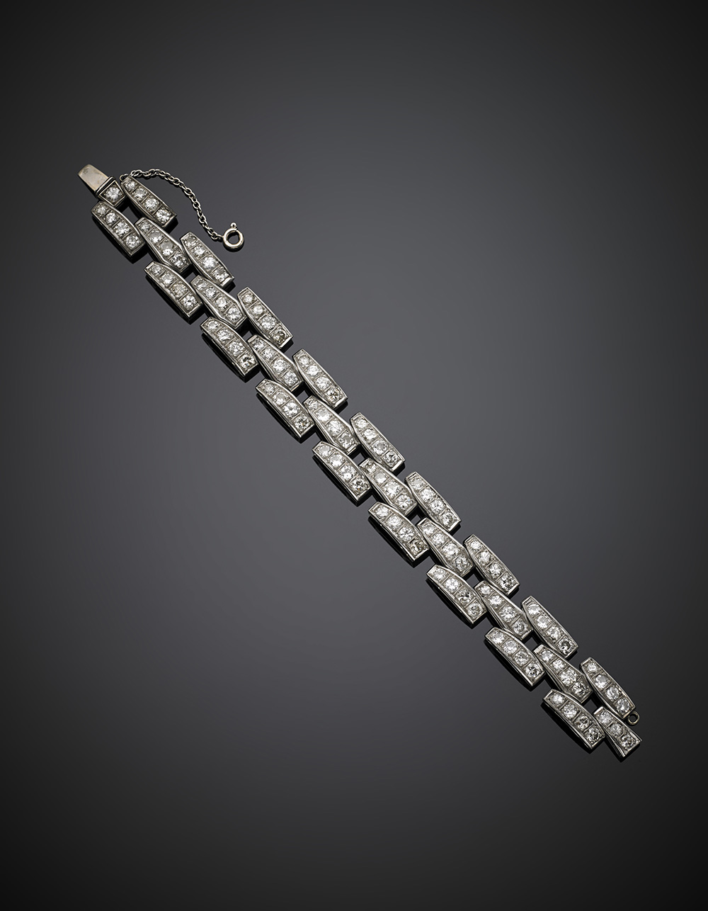 Bracciale modulare in oro bianco e diamanti per complessivi ct. 12,50 circa, g 36,58, lungh. cm 17 circa.
