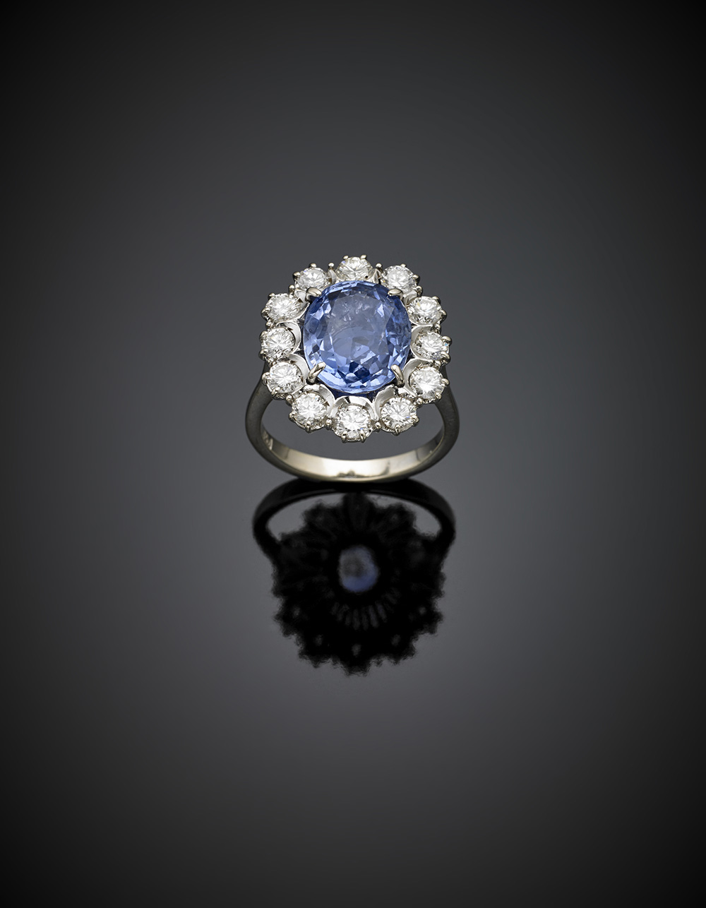 Oval ct. 5.90 circa sapphire and in all ct. 1.80 circa diamond white gold cluster ring, g 6.61 size 12/52.