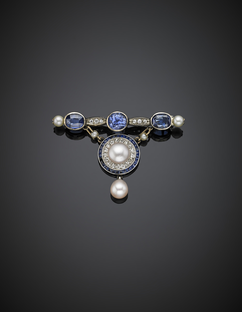 Platinum and gold diamond, pearl, oval synthetic and calibré sapphire bar brooch with detachable central pendant, g 5.01, length cm 4 circa. (losses)