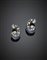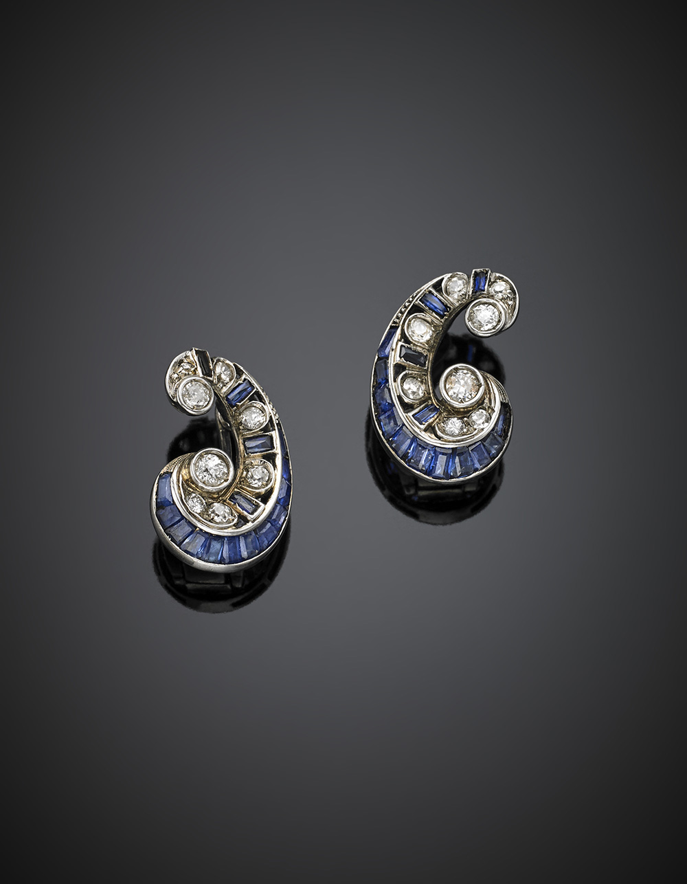 Orecchini a lobo con clip, a guisa di ricciolo in oro bianco, diamanti rotondi e zaffiri calibré, g 7,96, lungh. cm 2