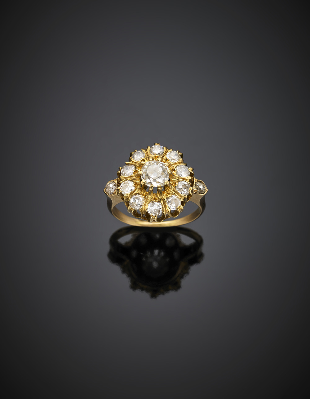 Yellow gold diamond cluster ring with a shaped stem, in all ct. 1 circa g 5.46 size 14/54. French hallmarks.