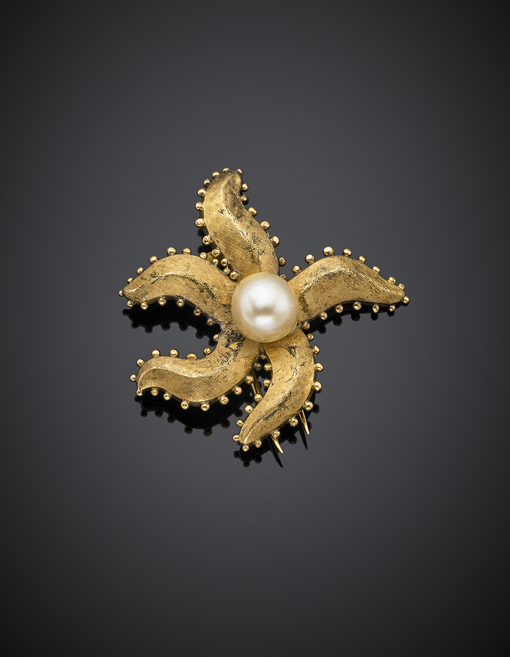 Spilla in oro giallo in parte satinato a guisa di stella marina con perla...
