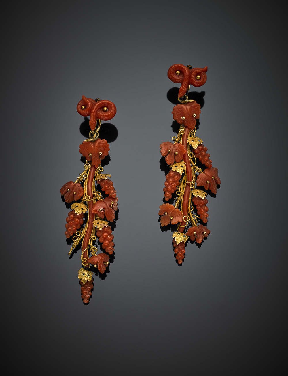 Orange carved coral and yellow gold grapevine pendant earrings, small snakes to hold them, g 7.43, length cm 6.50, diam. cm di circa. In original case