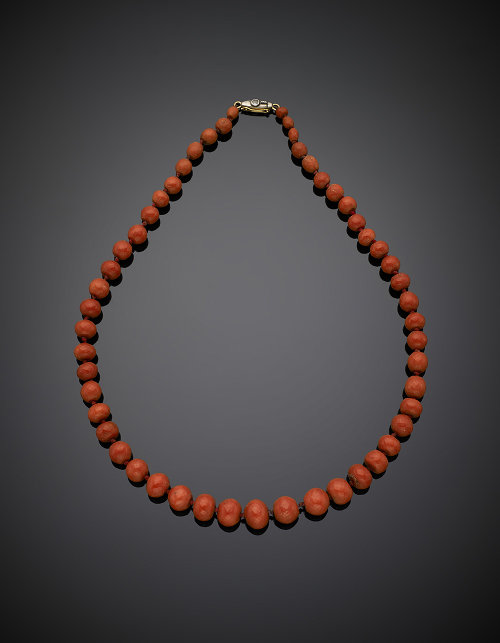 Orange coral faceted bead graduated necklace, bead diam. from mm 5.56 to mm 11.45 circa, g 46.07, length cm 50 circa.