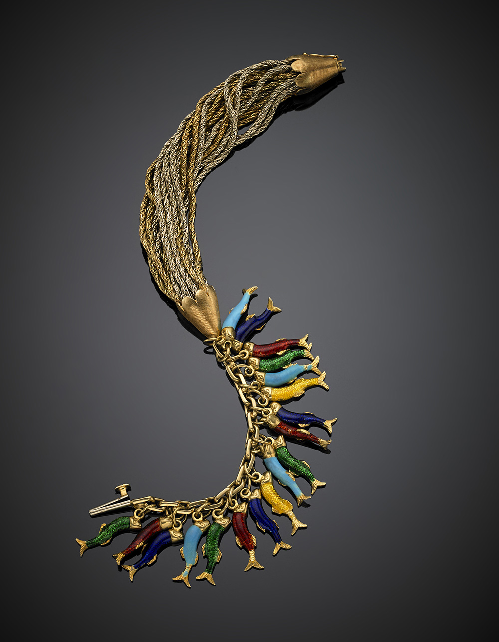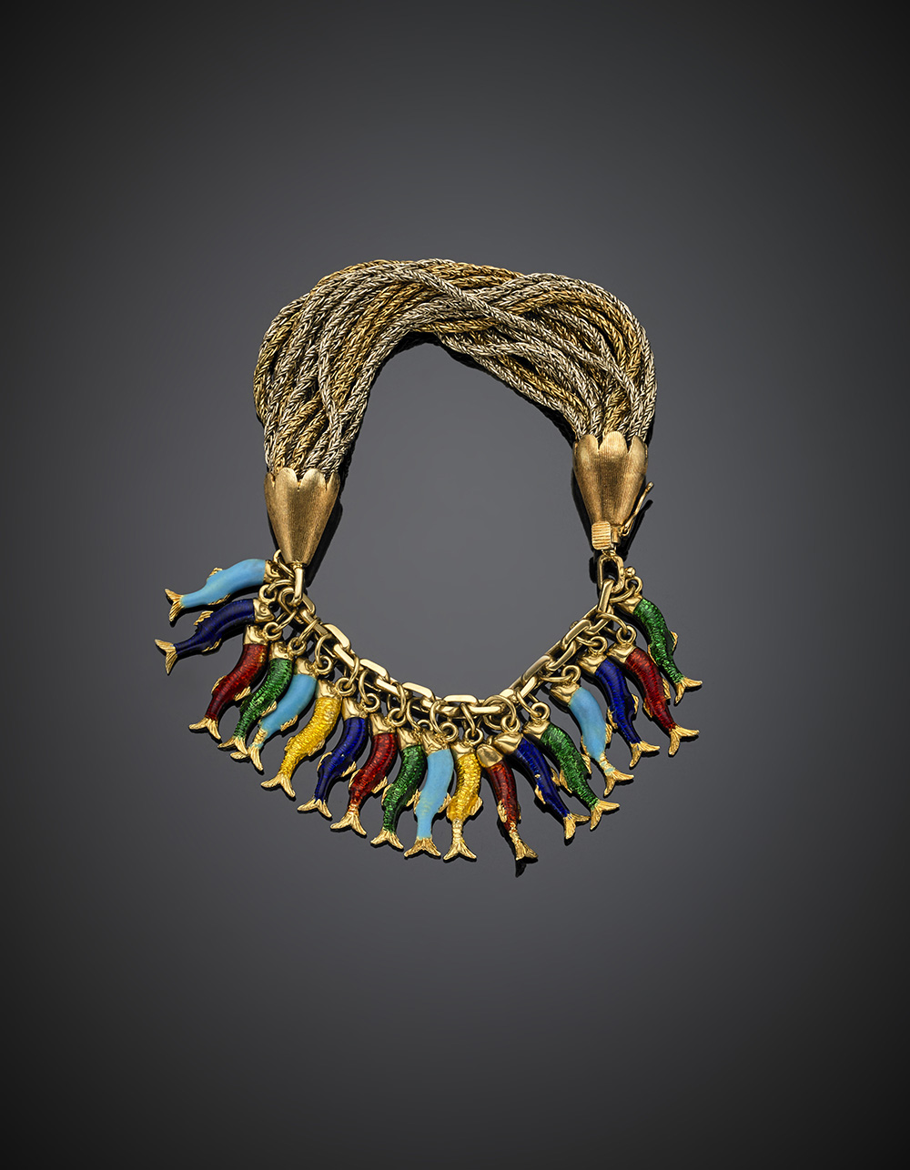 Bracciale multifili in oro giallo con diciannove charms a guisa di pesci rifiniti in smalti coprenti e smalti guilloché, g 99,42, lungh. cm 22 circa. Marcato 19510. (difetti)